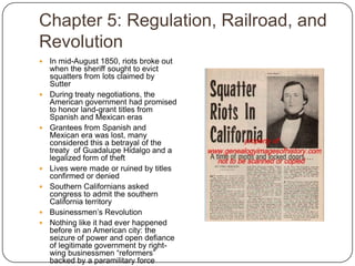 In mid-1850s, riots broke out in California when the sheriff sought to evict squatters from land claimed by John Sutter. During this time, many grants from the Spanish and Mexican eras were lost, as many felt this betrayed the Treaty of Guadalupe Hidalgo. In the 1860s, construction began on the ornate California State Capitol building. By the 1850s, the state established colleges, churches, and its first state prison at San Quentin. The completion of the transcontinental railroad in 1860 connected cities in the East and Midwest to California. In the 1870s, a bank failure in San Francisco caused a financial panic in the city. By the early 1900s, California was leading innovations in