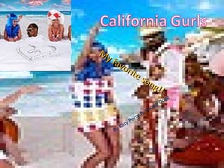 The document summarizes the song "California Gurls" by Katy Perry featuring Snoop Dogg. It describes the song as being about the beauty of California girls with their daisy dukes and bikinis. The lyrics depict the sunny beaches, palm trees, and laidback West Coast lifestyle. It also includes the chorus where Katy Perry sings about California girls being unforgettable and melting popsicles with their hot, sunkissed skin.