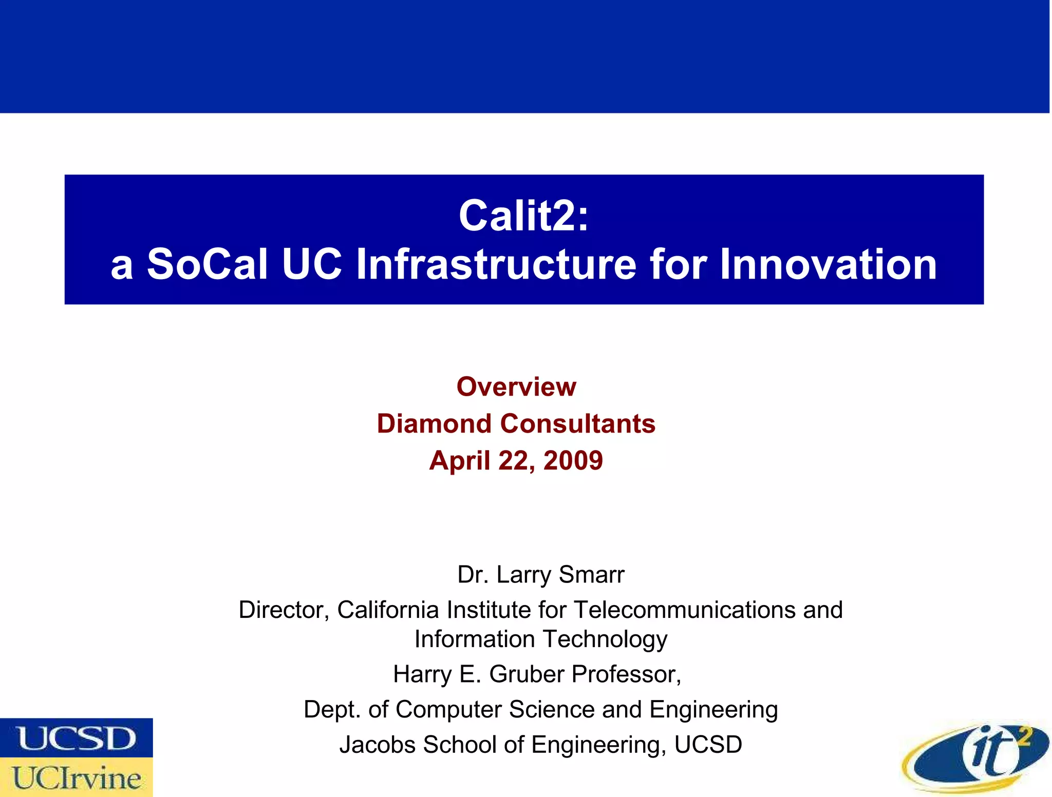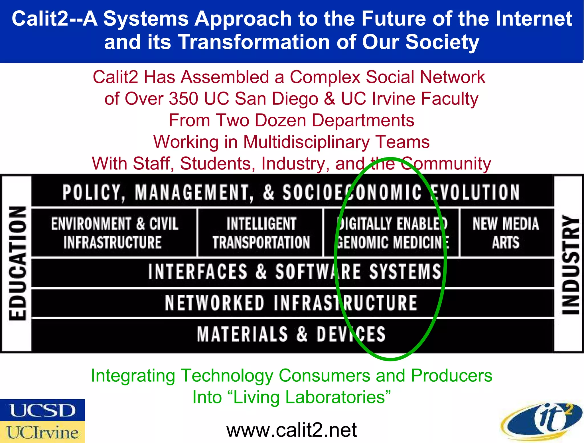 Calit2, a collaboration between UC San Diego and UC Irvine, consists of over 350 faculty, staff, and students working on multidisciplinary technology innovation projects. It has received significant funding to establish laboratories and support joint research initiatives, integrating industry partnerships to enhance entrepreneurial culture on campus. The initiative has also focused on advancing technologies in fields such as nanotechnology, optics, and wireless communication, resulting in numerous research grants and collaborative projects with industrial partners.