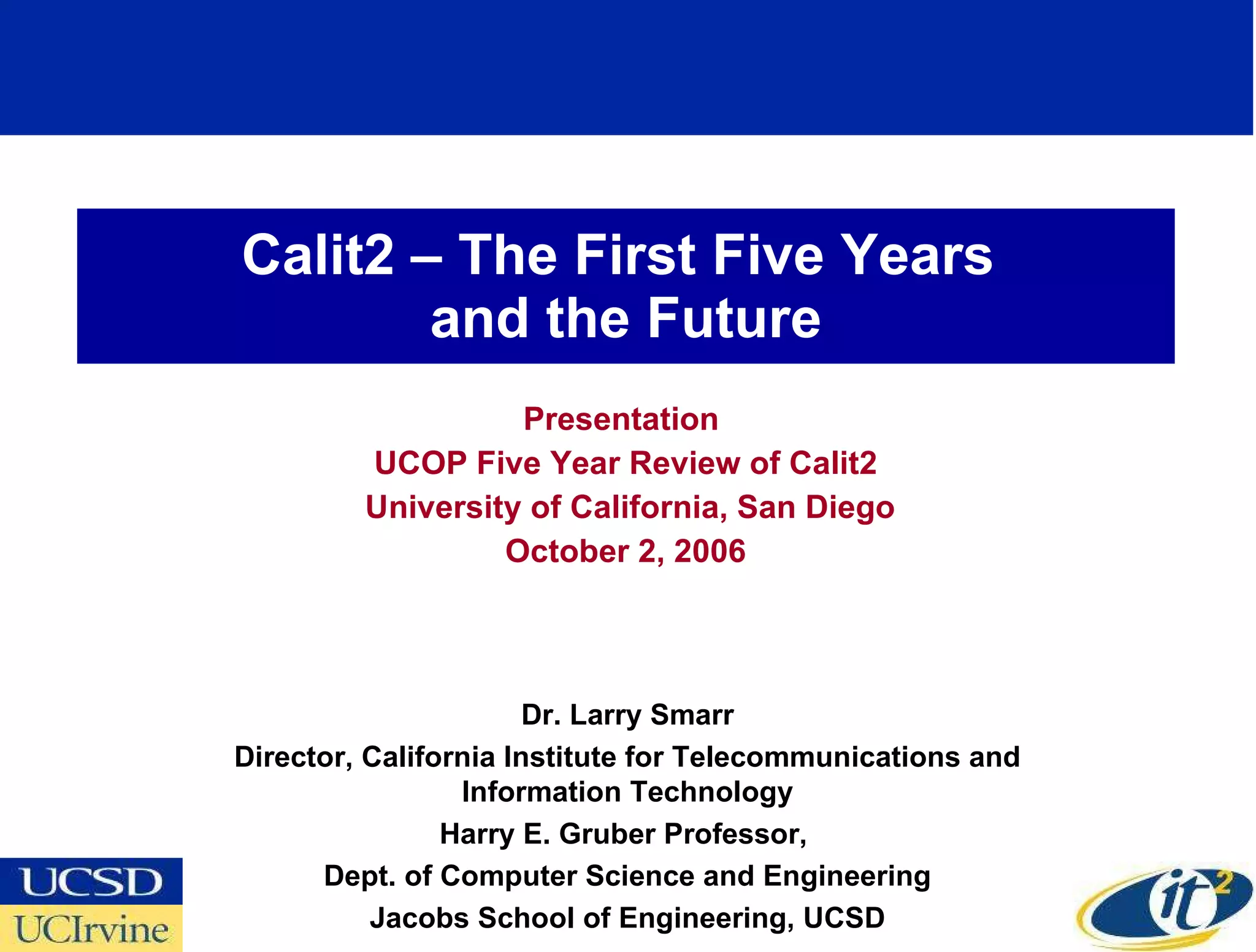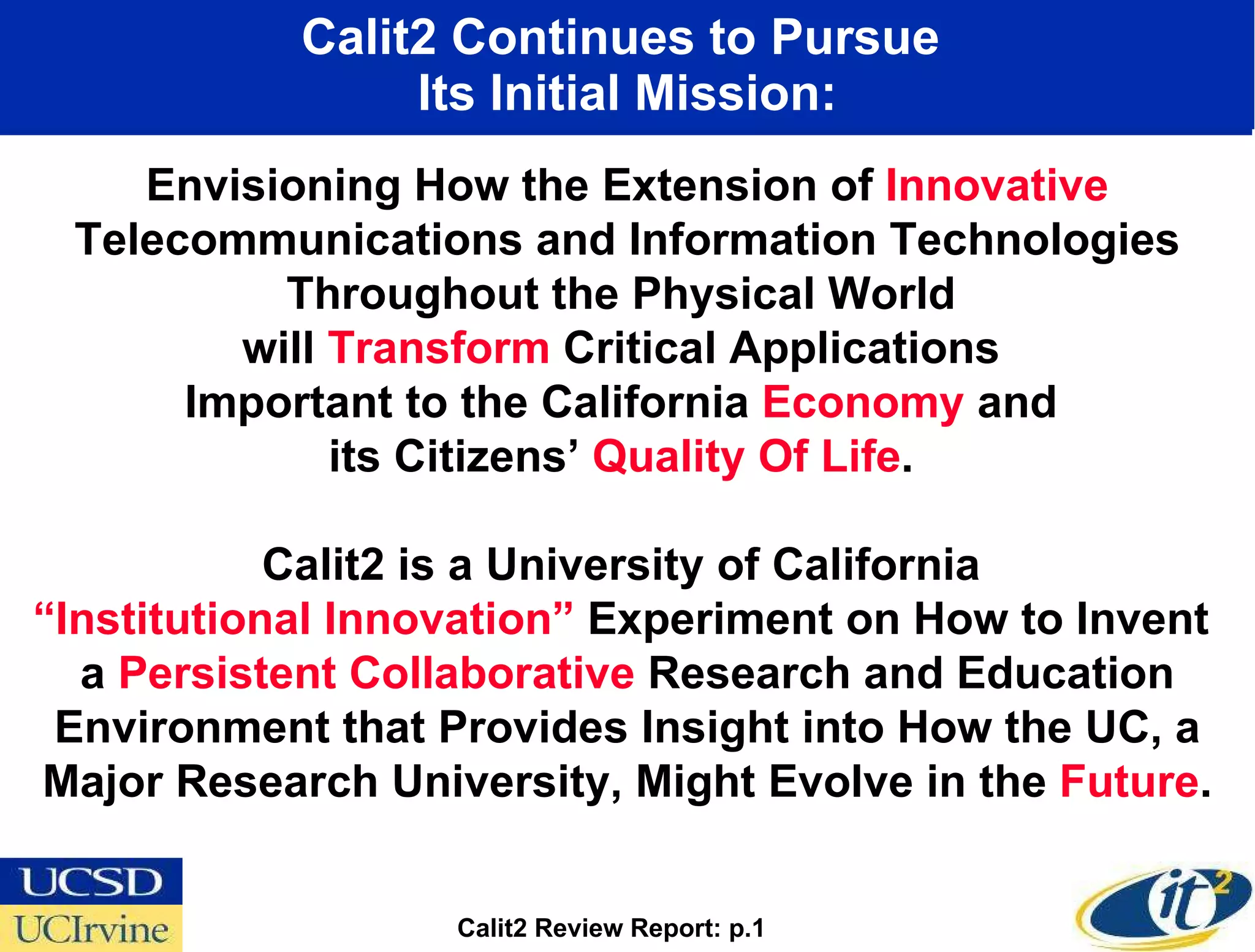 Calit2, the California Institute for Telecommunications and Information Technology, focuses on integrating innovative telecommunications and information technologies into the California economy and society. Over its first five years, Calit2 has built a collaborative research environment, formed partnerships with numerous industries, and attracted significant federal funding for research initiatives. Looking forward, Calit2 aims to enhance its role in shaping technology and society through ongoing innovation and international collaborations.