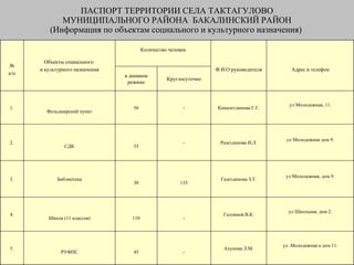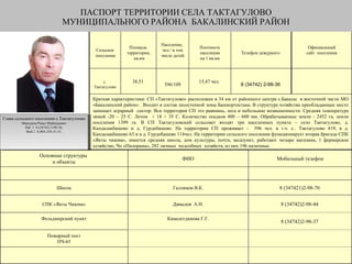 Документ является паспортом территории села Тактагулово в муниципальном районе Бакалинский район РБ, содержащим информацию о его населении, хозяйственных и социальных объектах. Село находится в лесостепной зоне, с преобладанием аграрного сектора, и население составляет 596 человек. В документе также указаны контактные данные руководителей различных учреждений и служб, работающих на этой территории.