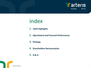 The document summarizes Arteris' 1Q14 results conference call. It discusses the company's operational and financial performance for the quarter, including a 5.4% increase in tolled traffic and growth in revenue and EBITDA. It also outlines the company's strategy going forward, which focuses on efficient capex delivery, sustainability, operations, and strengthening its corporate image. The document notes Arteris plans to pay a 50% dividend for fiscal year 2013 results.