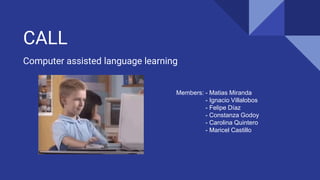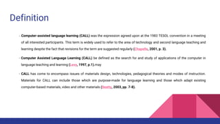 This document defines computer-assisted language learning (CALL) and outlines its main characteristics and advantages/disadvantages. CALL uses computers and software programs to teach language in a self-access or classroom setting. It allows for immediate feedback and makes classes more effective, though it can be expensive to implement. Examples of CALL software mentioned are FluentU and Babbel, which use authentic videos and audio recordings to teach language through interactive exercises, games, and communication activities.