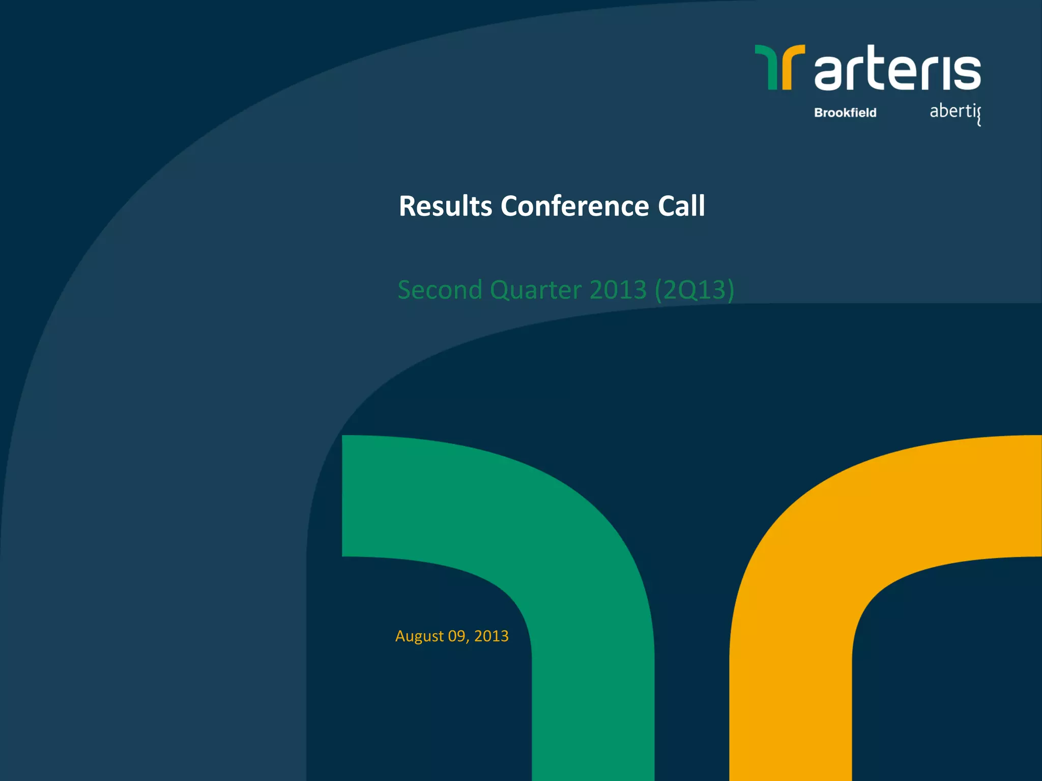 - The document summarizes the results of a 2Q13 earnings conference call for Arteris, a toll road operator in Brazil. It reported increased toll revenues and traffic volumes compared to 1Q13 and 2Q12. Adjusted EBITDA and net income were up for the quarter and half year period. Cash costs declined and margins increased. Total investments in road maintenance and infrastructure were lower in 2Q13 compared to prior periods. The company is on track to invest over R$1.3 billion in federal highways and R$140 million in state highways for 2013. Debt levels rose slightly but remained at comfortable ratios to cash flow.
