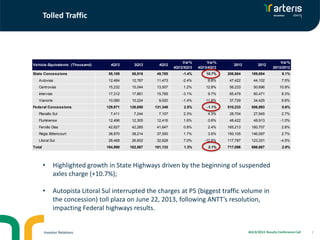 The document summarizes Arteris' results for the fourth quarter and full year of 2013. It shows that toll revenues grew 9.1% in 2013 driven by suspended axles charges and tariff increases. However, one concession had to stop charging tolls at a major plaza due to a regulatory decision, impacting results. Overall, gross revenue increased 8.2% while costs grew at a slower pace than revenues, improving margins. Adjusted EBITDA was up 8.3% and net income increased year-over-year. The company also provided details on its debt profile and forecasted investments of R$1.8 billion for 2014 as it continues expanding and maintaining its highway concessions.