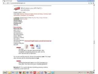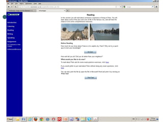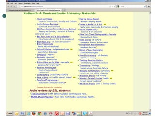 The document discusses several pedagogical advantages of computer-assisted language learning (CALL) materials, including nonlinearity, multimedia, empowerment of learners, monitoring of learning behavior, authenticity, feedback, and new types of activities. It also covers how technology can enhance reading, writing, grammar, vocabulary, and spoken language practice. Several examples are provided of CALL resources and websites that support language learning.