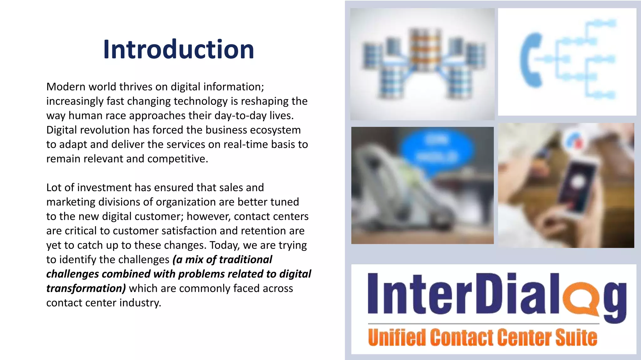 The document outlines common challenges faced by call center management, particularly in adapting to digital transformation, such as difficulty in addressing customer grievances across various platforms and the need for unified interaction management solutions. It highlights the importance of modern contact center software features like callback options and intelligent reconnect to improve customer satisfaction and agent productivity. Teckinfo's Interdialog UCCS is presented as a solution to these industry challenges, promoting efficiency and customer happiness.