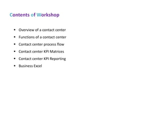 This document summarizes a workshop on call center management and reporting. It discusses the key functions of a contact center including workforce management, quality management, technology management, reporting, and financial management. It also outlines the contact center process flow from workforce planning to operations to monitoring and analysis. Finally, it discusses important key performance indicators that contact centers use to measure performance, such as service level, average speed of answer, abandon rate, and adherence.