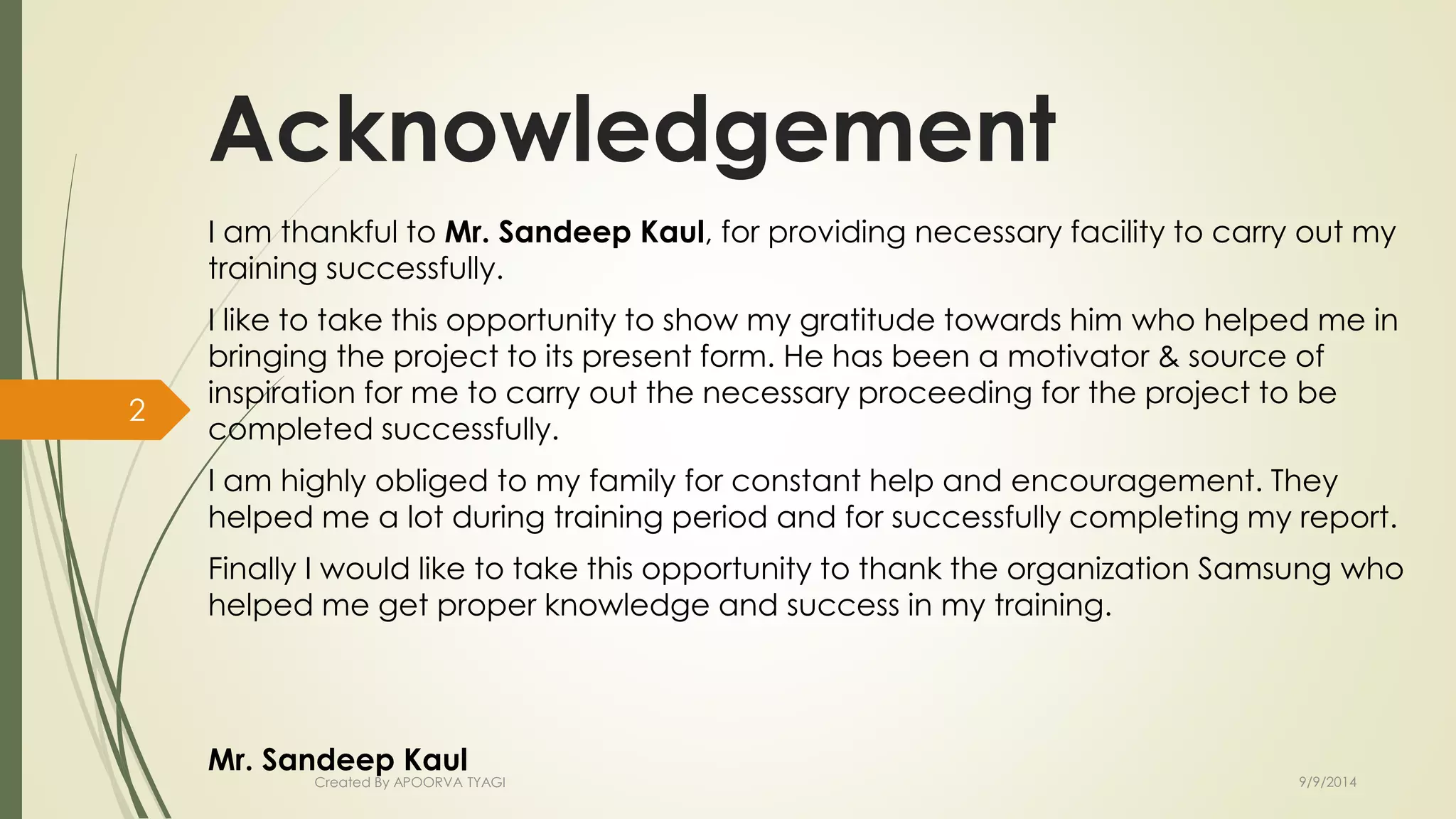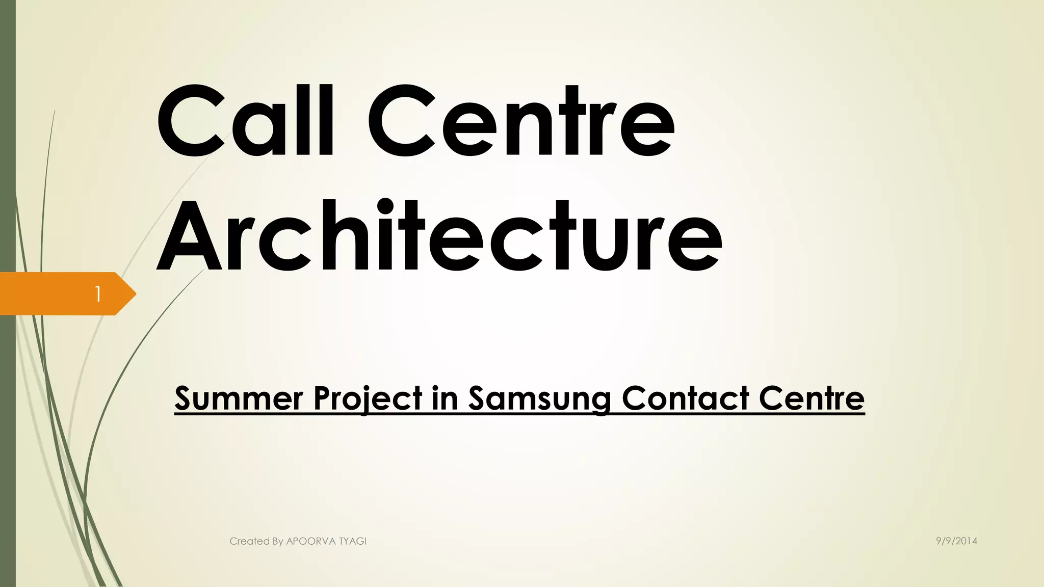 This document provides an overview of a summer project at Samsung's contact center. It discusses the author's acknowledgements and thanks to those who helped with the project. It then provides details on call center architecture, types of call center software including Automatic Call Distribution (ACD) and Computer Telephony Integration (CTI). Specifics are given on Avaya's call management system and call flow, as well as their voice solutions, Definity systems, and port network concepts.