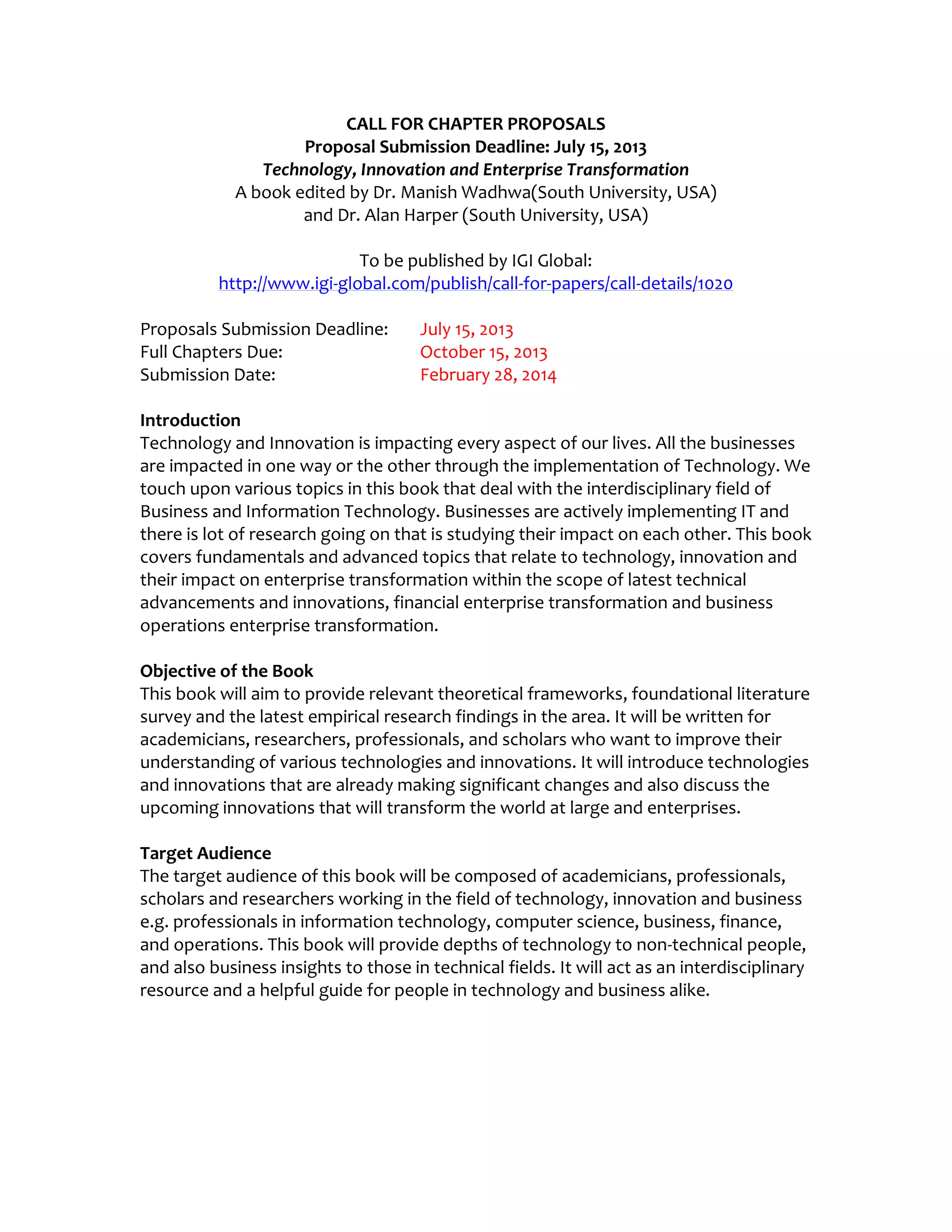 The document is a call for chapter proposals for a book titled 'Technology, Innovation and Enterprise Transformation,' edited by Dr. Manish Wadhwa and Dr. Alan Harper, with a submission deadline of July 15, 2013. It targets academicians, researchers, and professionals, discussing the interdisciplinary implications of technology and innovation on business operations and financial enterprise transformation. The publication is expected in December 2014, following a review process for submitted chapters.