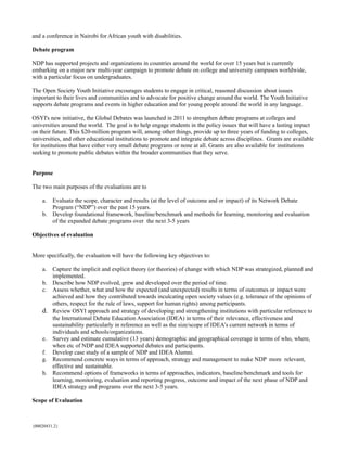 The Open Society Foundations is seeking proposals to evaluate their Network Debate Program from the past 15 years and develop an evaluation framework for the next 3-5 years. Specifically, the evaluation will (1) assess the outcomes and impact of the debate programs, (2) review the strategy of the International Debate Education Association, and (3) make recommendations to strengthen the debate programs and develop learning, monitoring, and evaluation tools for the future. The scope will cover debates in over 70 countries and engage stakeholders from OSF, IDEA, debate participants, and external experts.
