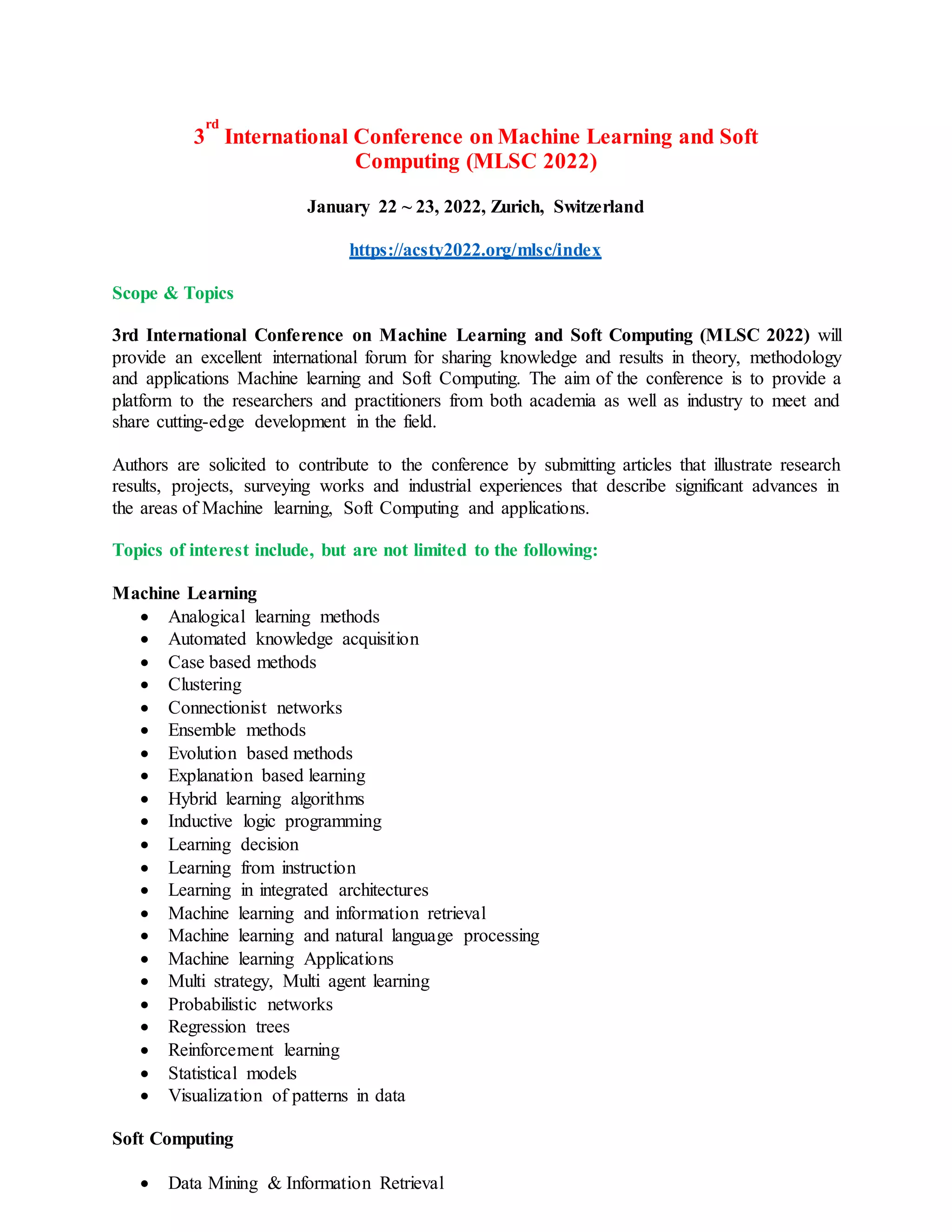 The 3rd International Conference on Machine Learning and Soft Computing (MLSC 2022) is scheduled for January 22-23, 2022, in Zurich, Switzerland, aimed at fostering a forum for researchers and practitioners to discuss advancements in machine learning and soft computing. Authors are invited to submit original papers by January 1, 2022, which will be reviewed for publication in conference proceedings and select journals. Key topics include a wide range of methodologies and applications within machine learning and soft computing fields.