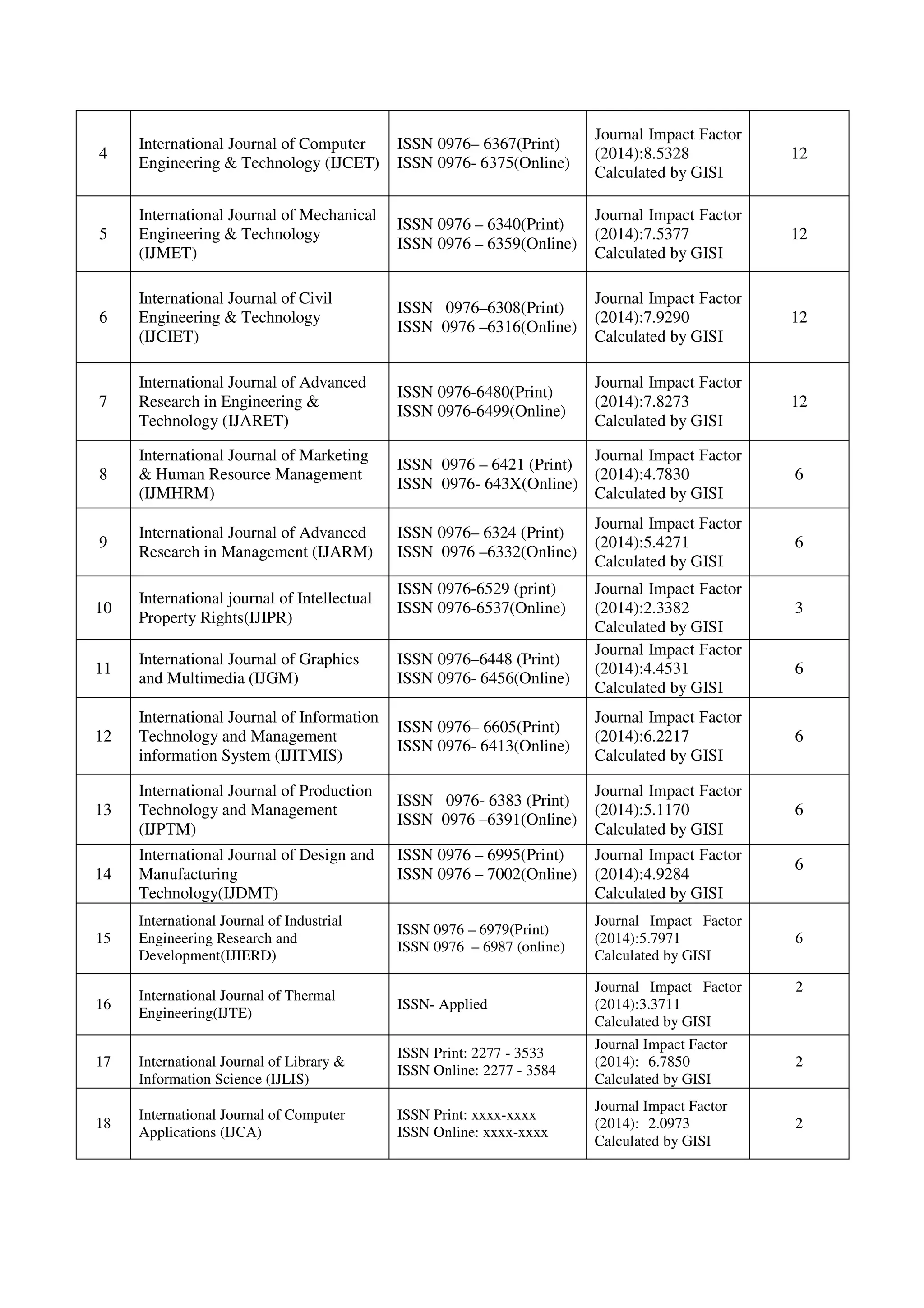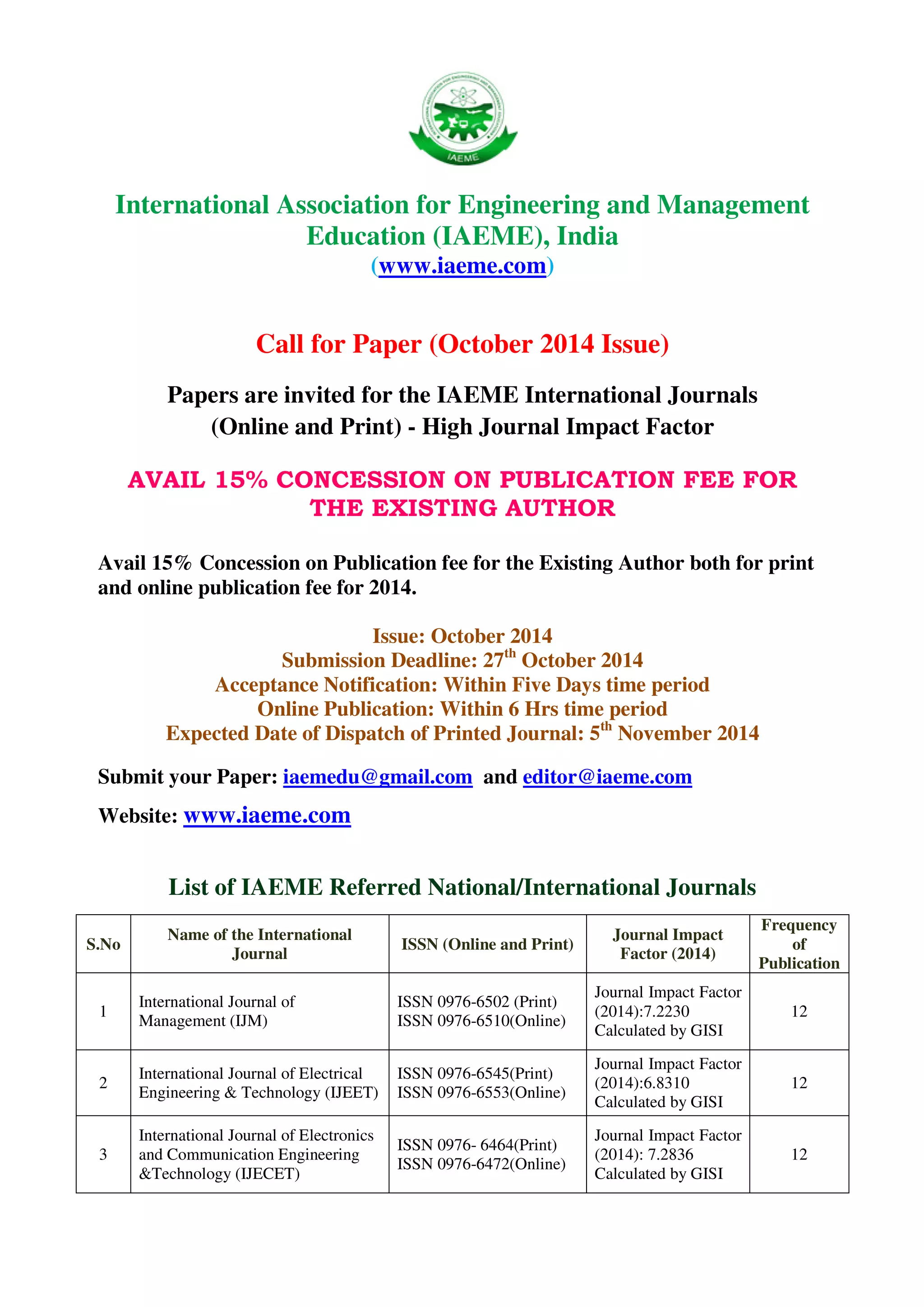 The document announces a call for papers for various engineering and management journals published by the International Association for Engineering and Management Education. It provides details such as submission deadlines of October 27, 2014, notification of acceptance within 5 days, online publication within 6 hours, and dispatch of printed journals by November 5, 2014. It lists 24 journals across various disciplines and provides each journal's ISSN numbers and calculated impact factor for 2014. The document outlines guidelines for paper submission and the publication charges for online only and online plus print publication.