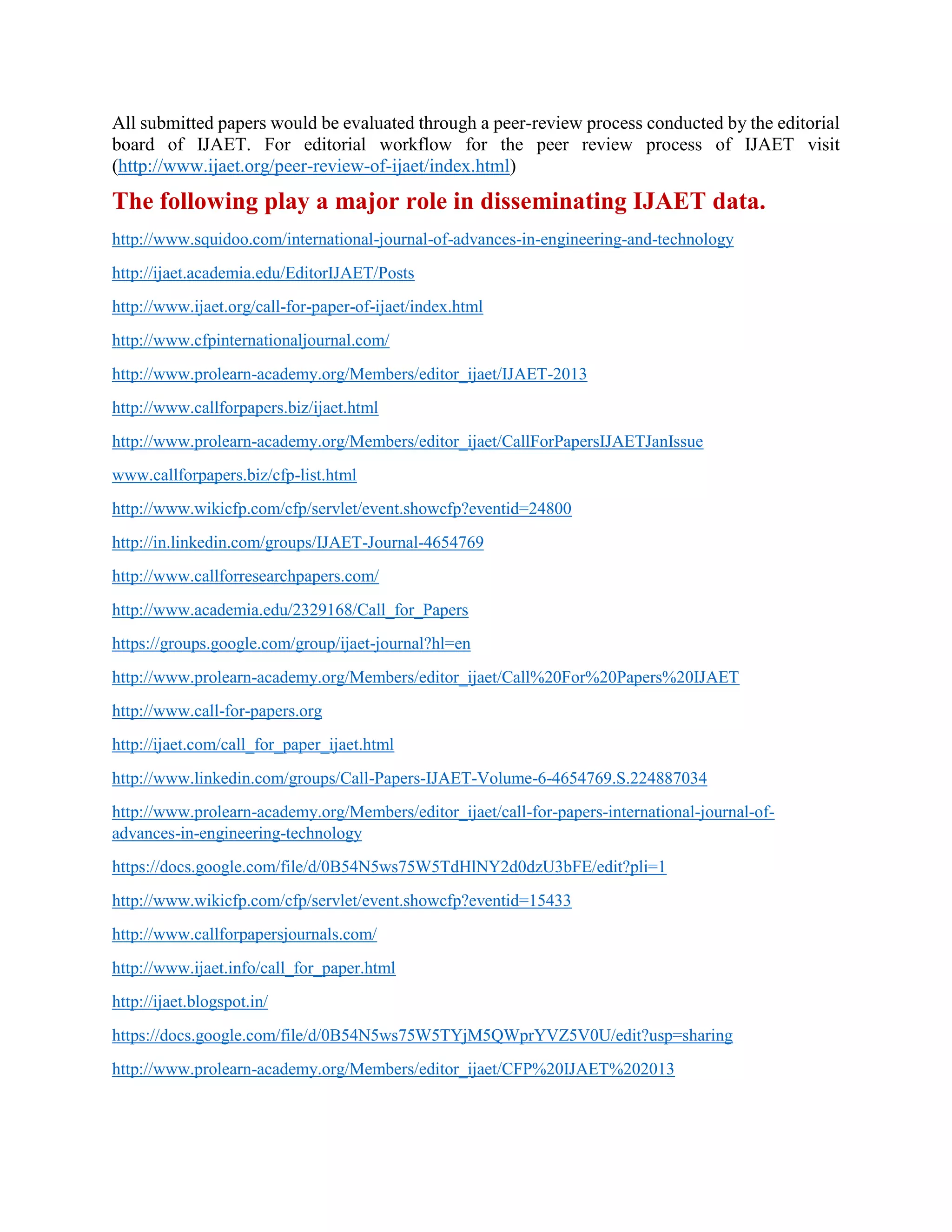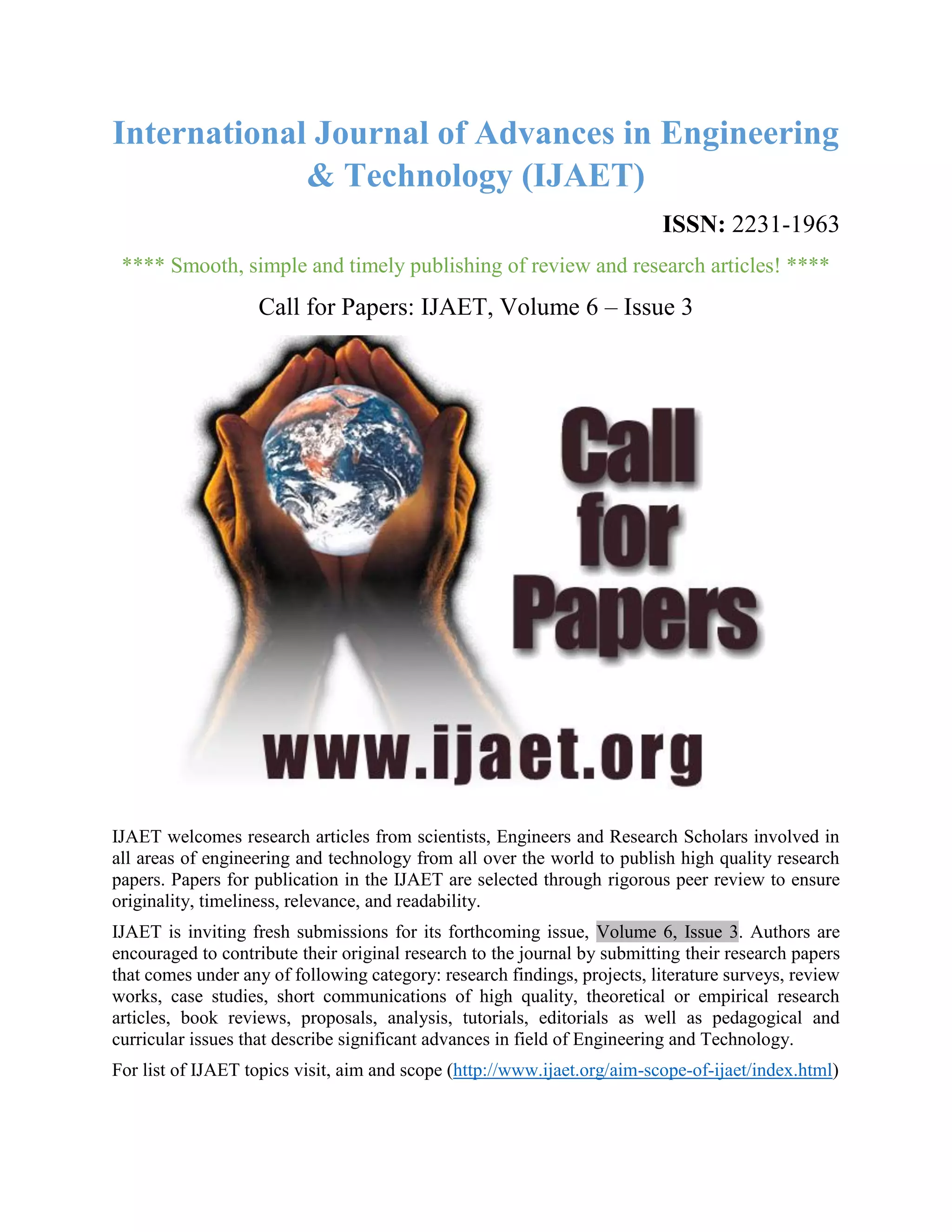 The International Journal of Advances in Engineering & Technology (IJAET) is inviting submissions for its upcoming Volume 6, Issue 3, focusing on high-quality research across all areas of engineering and technology. Submitted papers will undergo a rigorous peer-review process to ensure originality and relevance. Authors can contribute a variety of article types, including research findings, reviews, case studies, and more, with further details available on the journal's website.