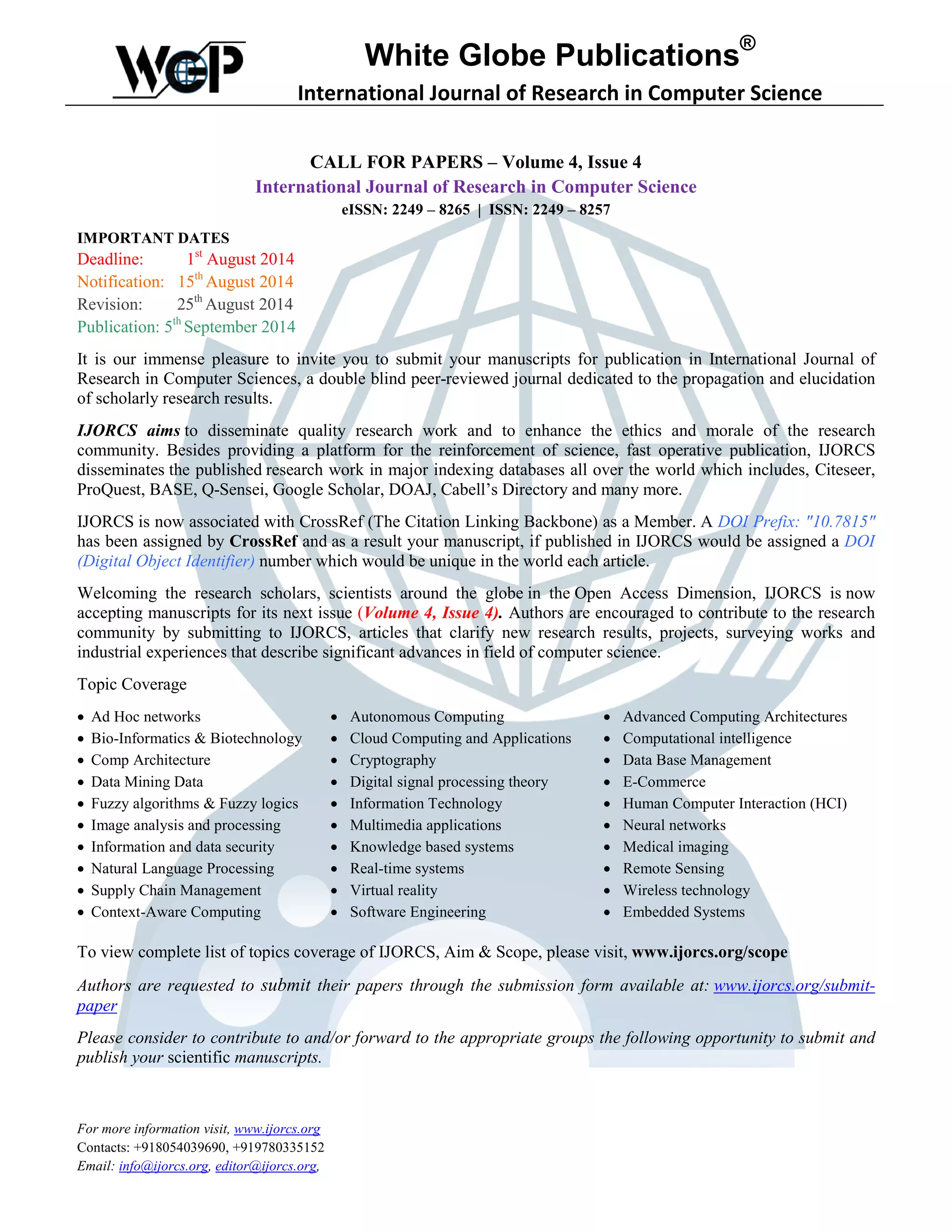 The International Journal of Research in Computer Science is inviting submissions for its Volume 4, Issue 4, with a deadline for manuscripts on August 1, 2014. The journal is dedicated to disseminating quality research in computer science and aims to enhance the research community's ethics and morale. The published articles will be indexed in major databases and assigned a unique DOI for global recognition.