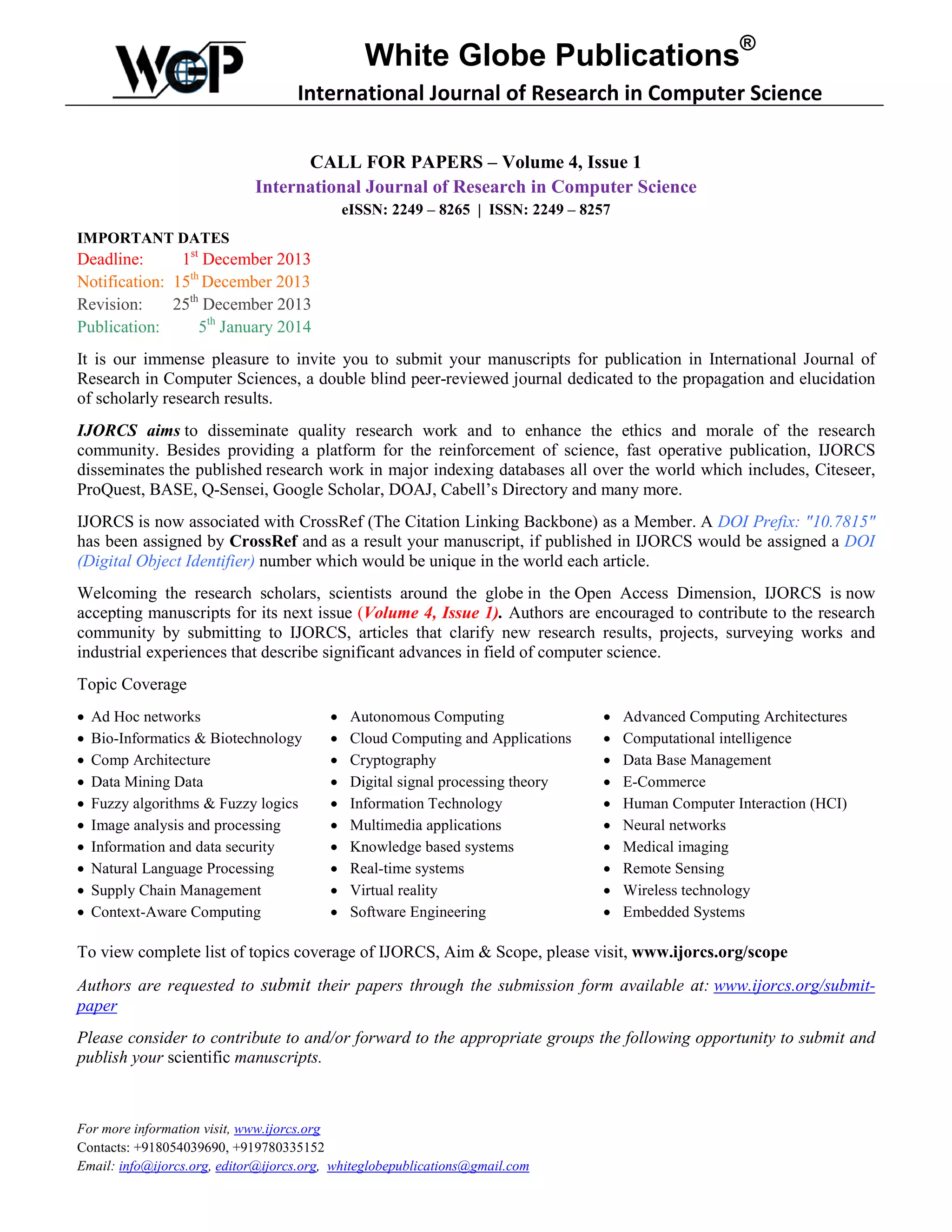 The International Journal of Research in Computer Science is inviting manuscript submissions for its Volume 4, Issue 1, with deadlines for submission on December 1, 2013, and publication on January 5, 2014. This double-blind peer-reviewed journal aims to disseminate quality research in various fields of computer science, ensuring wide visibility through major indexing databases. Authors are encouraged to submit research, projects, and reviews covering topics like data mining, cloud computing, and software engineering.