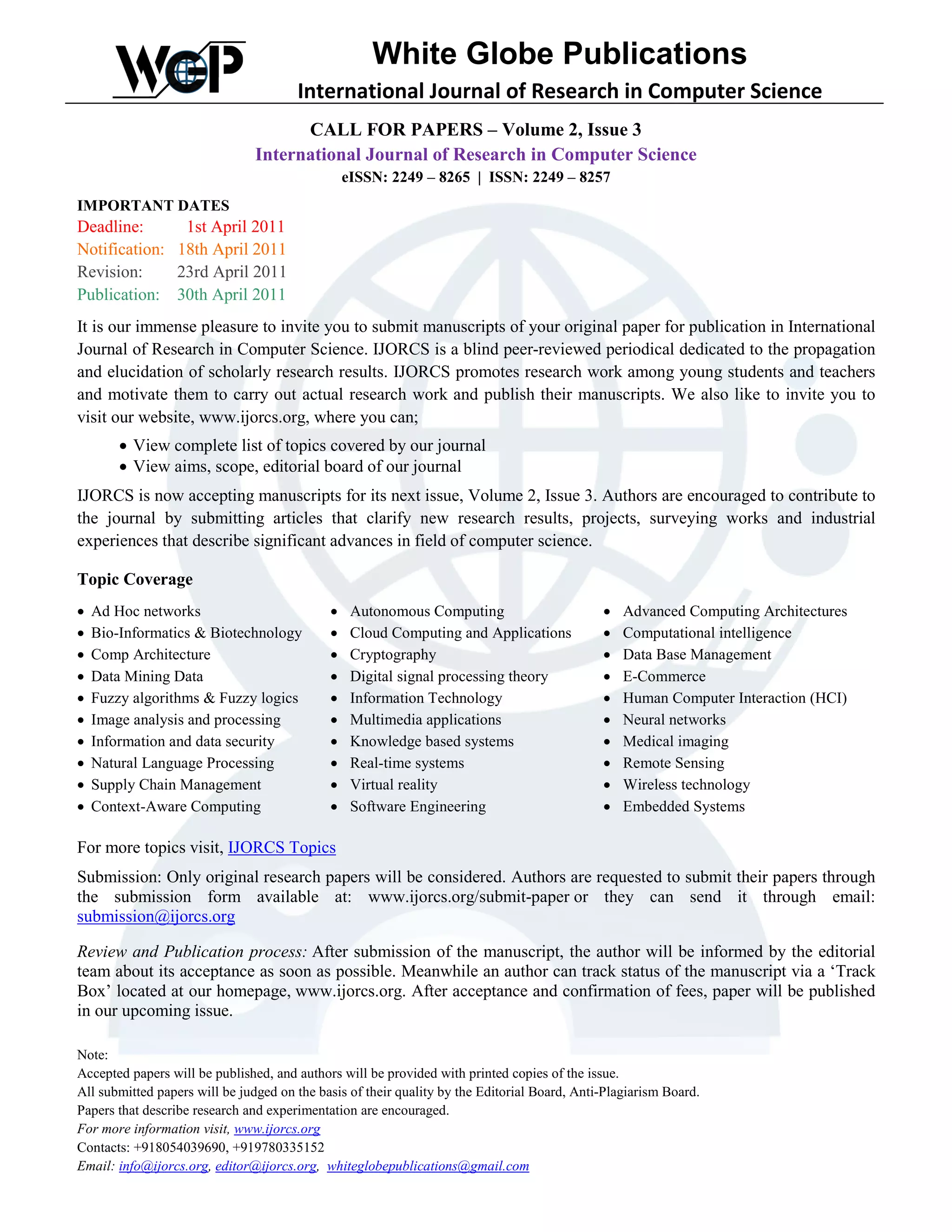 The International Journal of Research in Computer Science (IJORCS) is calling for original research paper submissions for its Volume 2, Issue 3, with a deadline of April 1, 2011. The journal focuses on a wide range of topics in computer science and follows a blind peer-review process. Authors can submit manuscripts through the journal's website or via email, and accepted papers will be published in the upcoming issue with printed copies provided.