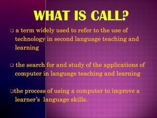 The document provides information about a group project done by 14 students for a course on Language Learning and Language Use. The project involved using various web-based modalities like blogs, Ustream, and Skype for language teaching. It discusses the theories, objectives, content and activities for using these tools. The summary highlights the key modalities used, the objectives of facilitating experiential learning and greater interaction, and that it was done in partial fulfillment of course requirements.