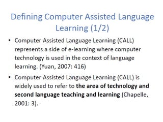This document provides an overview of Computer-Assisted Language Learning (CALL). It discusses the objectives and assumptions of a CALL course, including providing students opportunities to explore online resources. It also outlines the benefits and limitations of CALL, such as increased learner autonomy but also potential anti-social behavior. Key factors for CALL success are identified, such as appropriate resources, training for teachers and students, and an emphasis on interactivity.