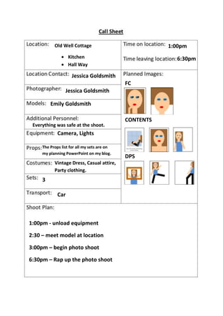 The document provides a schedule for a photo shoot taking place at Old Well Cottage. It lists the locations as the kitchen at 1:00pm and hallway at 6:30pm. It also includes prop lists and clothing options for the shoot. The schedule has equipment unloading at 1:00pm, meeting the model at 2:30pm, starting the shoot at 3:00pm, and wrapping up at 6:30pm.
