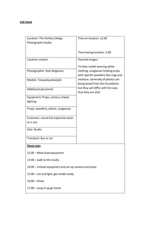A fashion photo shoot is scheduled for May 15th at the Henley College photography studio from 12pm to 5pm. Photographer Kyle McGarvey will be shooting model Toluwaloju Awojobi wearing various outfits and accessories provided as props. The shoot plan involves meeting at 12pm, setting up equipment from 1-3pm, lighting and styling the model from 3-4pm, shooting from 4-5pm, then wrapping up by 5pm.