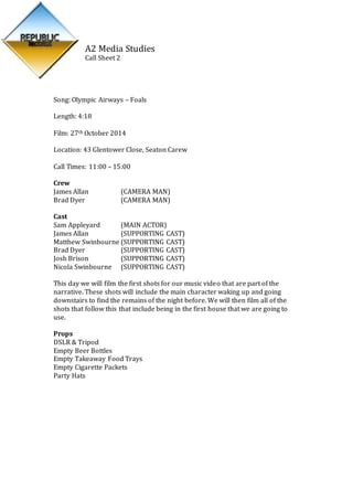 This call sheet provides details for filming a music video on October 27th at 43 Glentower Close in Seaton Carew. It lists the song and length, call times from 11am to 3pm, and crew including two camera men and six cast members. The filming will capture the narrative's first shots of the main character waking up and discovering the remnants of the previous night's party downstairs in the first house location.