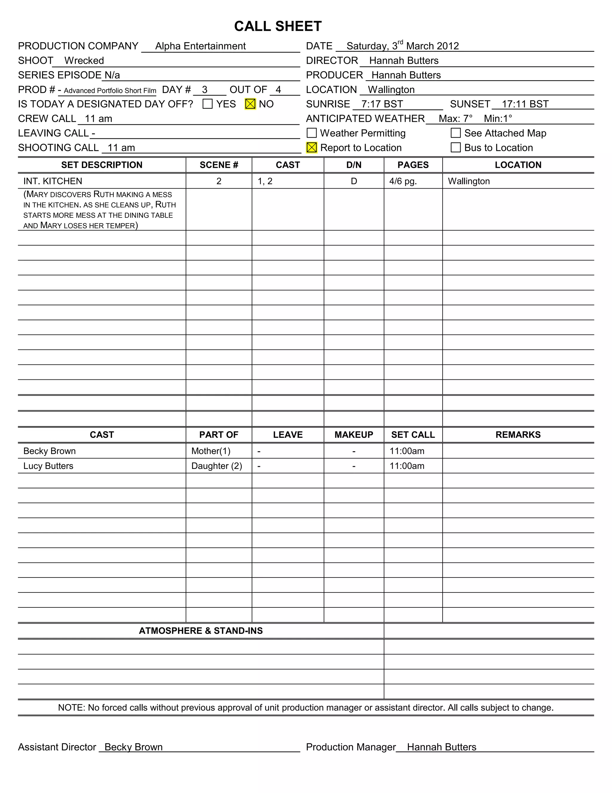 The call sheet provides details for the third day of shooting the short film "Wrecked". It will take place on March 3rd, 2012 at a location in Wallington. The crew call time is 11am and they will shoot scene 2 indoors in the kitchen. The scene involves a mother discovering her daughter making a mess and losing her temper as the mess gets worse. Becky Brown and Lucy Butters are called to play the mother and daughter roles.