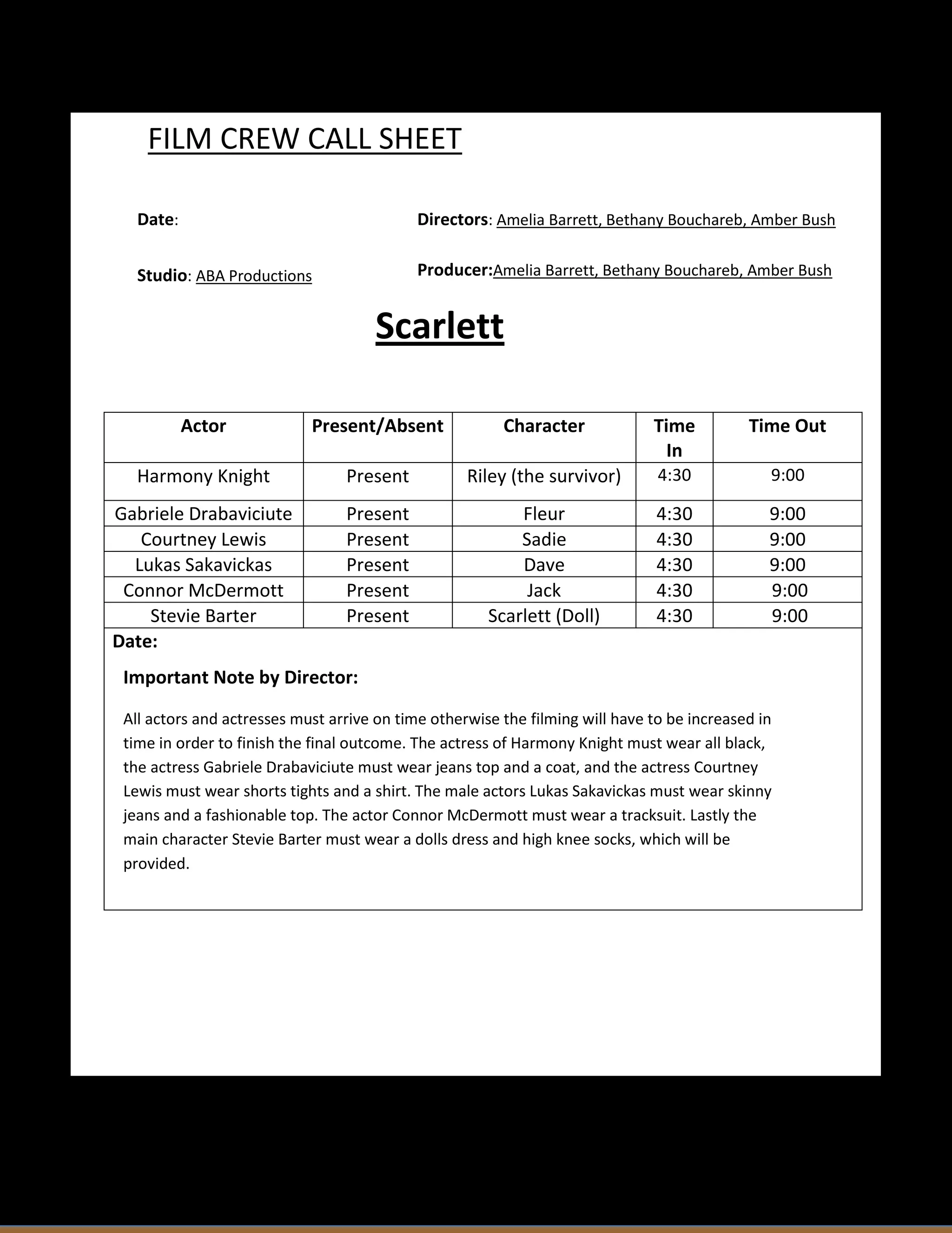 The film crew call sheet lists the actors and their characters, and their call times from 4:30pm to 9:00pm. It notes that Harmony Knight must wear all black, Gabriele Drabaviciute must wear jeans and a coat, and Courtney Lewis must wear shorts, tights and a shirt. It also specifies the outfits for the male actors Lukas Sakavickas and Connor McDermott. The main character Stevie Barter must wear a doll's dress and knee socks, which will be provided. The director provides an important note that all actors must arrive on time or else filming may need to be extended.