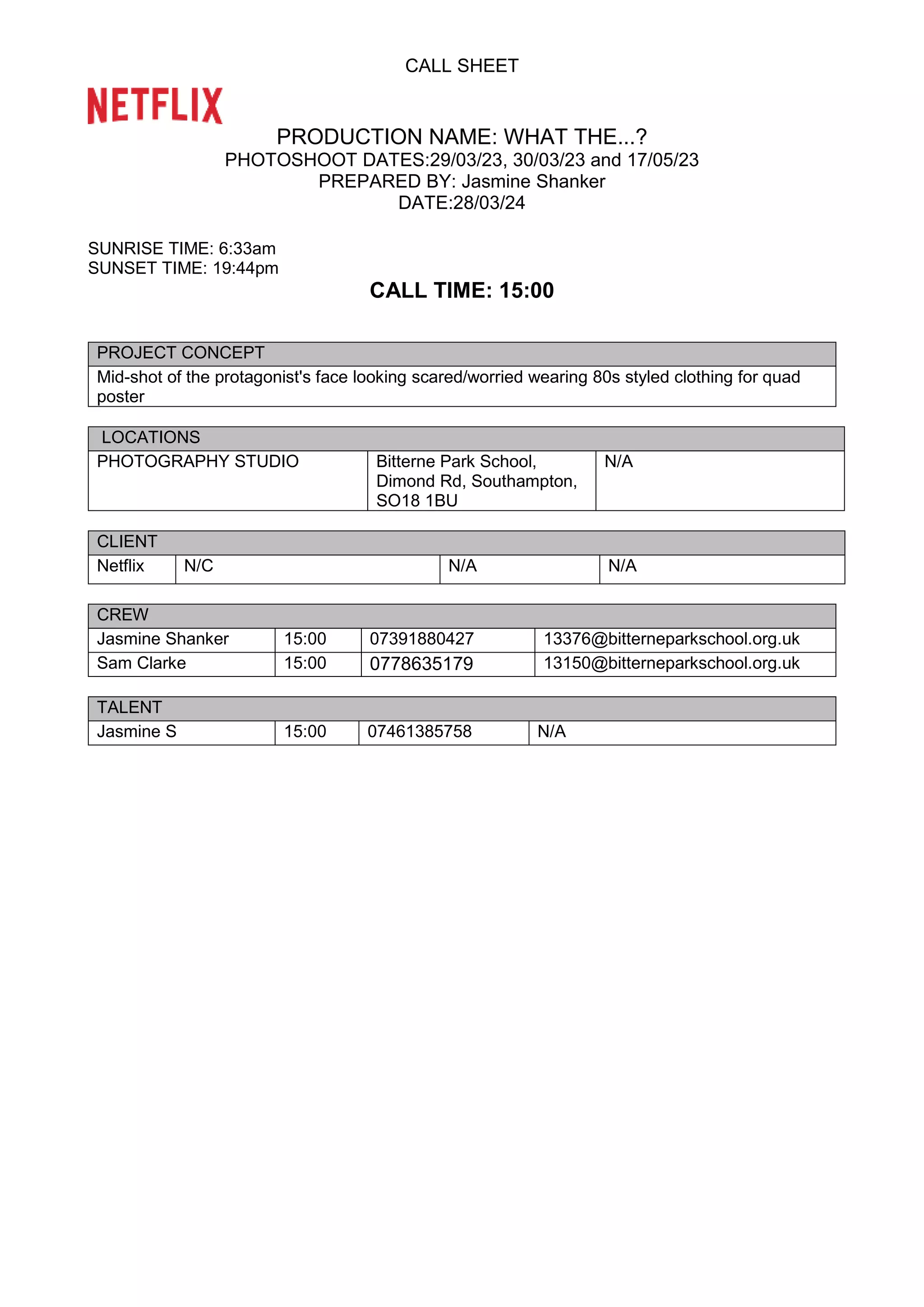 The call sheet provides details for a photoshoot on March 29th-30th and May 17th featuring a mid-shot of a protagonist looking scared for a Netflix project. The photoshoot will take place at Bitterne Park School in Southampton and will involve a photographer, assistant, and model. The call time is 3pm and shooting is scheduled to capture mid-shots of the model looking scared from 3:05-3:20pm, with wrap-up by 3:32pm. The model is asked to arrive in the discussed costume.