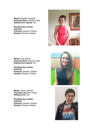 This call sheet provides information for a photo shoot, listing 9 models and their character roles. Shannon Watson is listed as both the producer and director for the shoot. Each model's name, character role, and confirmation that a release form was signed is included, along with blanks for the shooting day number and call time.