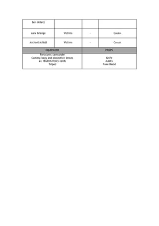 This call sheet is for the opening scene of the horror short film "House of Balloons" directed by Tom Millett. It will be filmed at 5 Lowther Close in Billingham on an unspecified date. Tom Millett will serve as the director, producer, cinematographer and play the killer. The film stars Paul Mason and Wesley Aitchison as additional killers and Alex Grange, Michael Millett, Tom Moore and Ben Millett as victims. Equipment needed includes a Panasonic camcorder, camera bags, memory cards, a tripod, a knife, masks and fake blood.