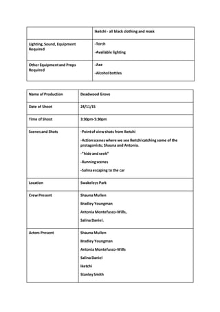 The call sheet provides details for filming scenes on November 23rd and 24th for the production "Deadwood Grove". On the 23rd, scenes will be filmed at Little Britain Lake including establishing shots, a discussion about a disappearance, and a "fun montage". Specific costumes are listed for the actors. On the 24th, scenes will be filmed at Swakeleys Park including point of view shots from the character Iketchi catching other characters and a hiding/running scene. The same costumes and equipment including a torch, available lighting, axe and alcohol bottles are needed on both days of filming.