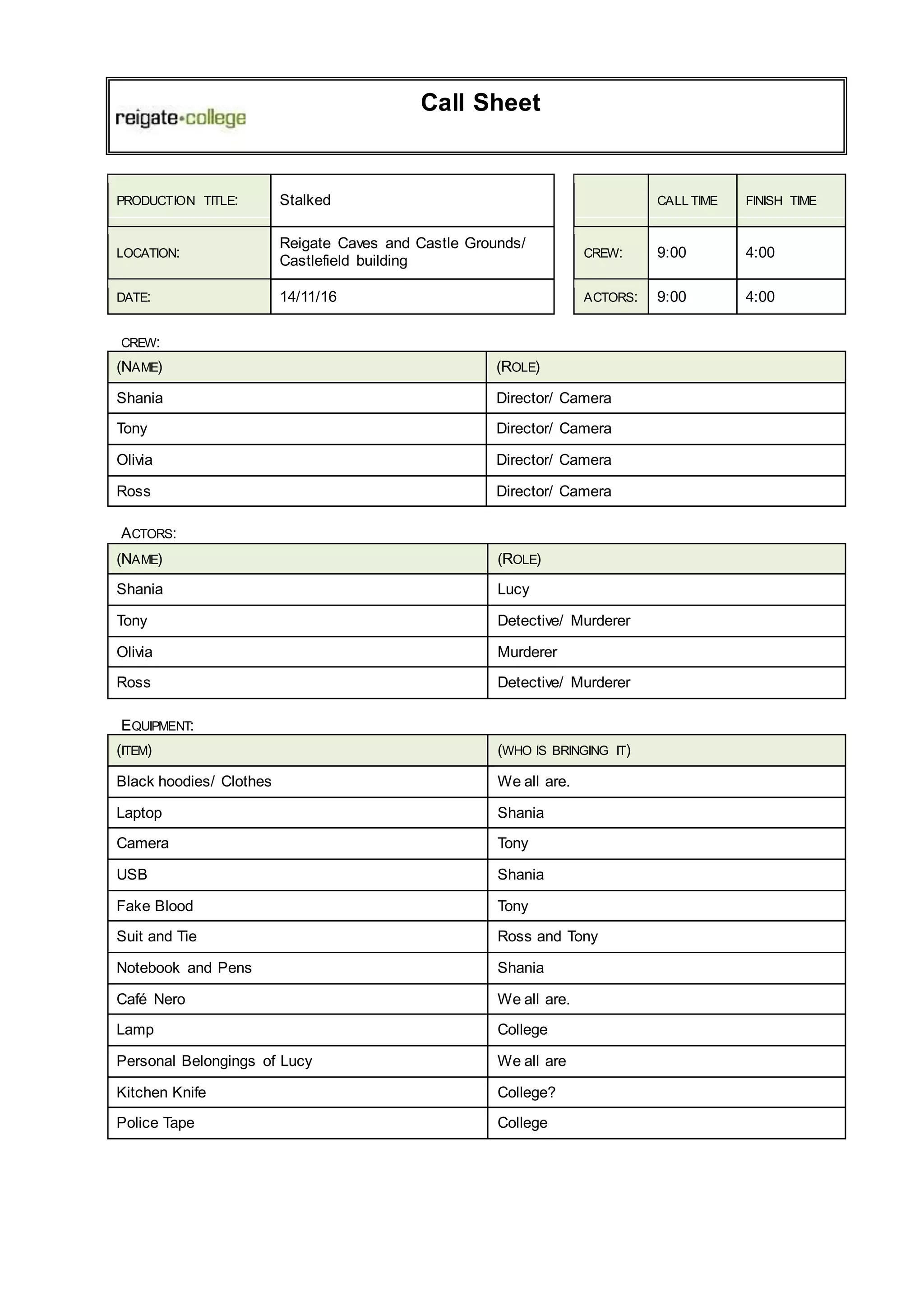 This call sheet provides production details for the short film "Stalked" being filmed on November 14th at Reigate Caves and Castle Grounds. It lists a crew of 4 and 4 actors who will play detectives, murderers and a victim. The call time is 9am and filming will finish at 4pm. It includes a list of equipment like costumes, cameras, props and makeup that various crew members will bring to the shoot.