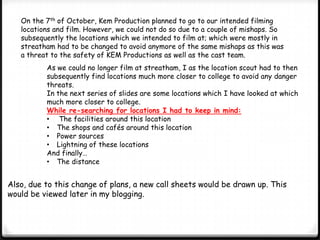 Due to safety mishaps, Kem Production had to change their filming locations from Streatham to areas closer to college. As the location scout, the document's author scouted potential new locations such as Clapham Park. One location found was Clapham Common, which despite not being as suitable as Streatham Common, was a safe substitute close to college. The author also found a potential exterior location for a grandmother's house but it required permission. Additionally, St. Paul's Church in Clapham was scouted as a potential interior church location. However, the grandmother's house scene ultimately had to be changed entirely due to no suitable house being found.