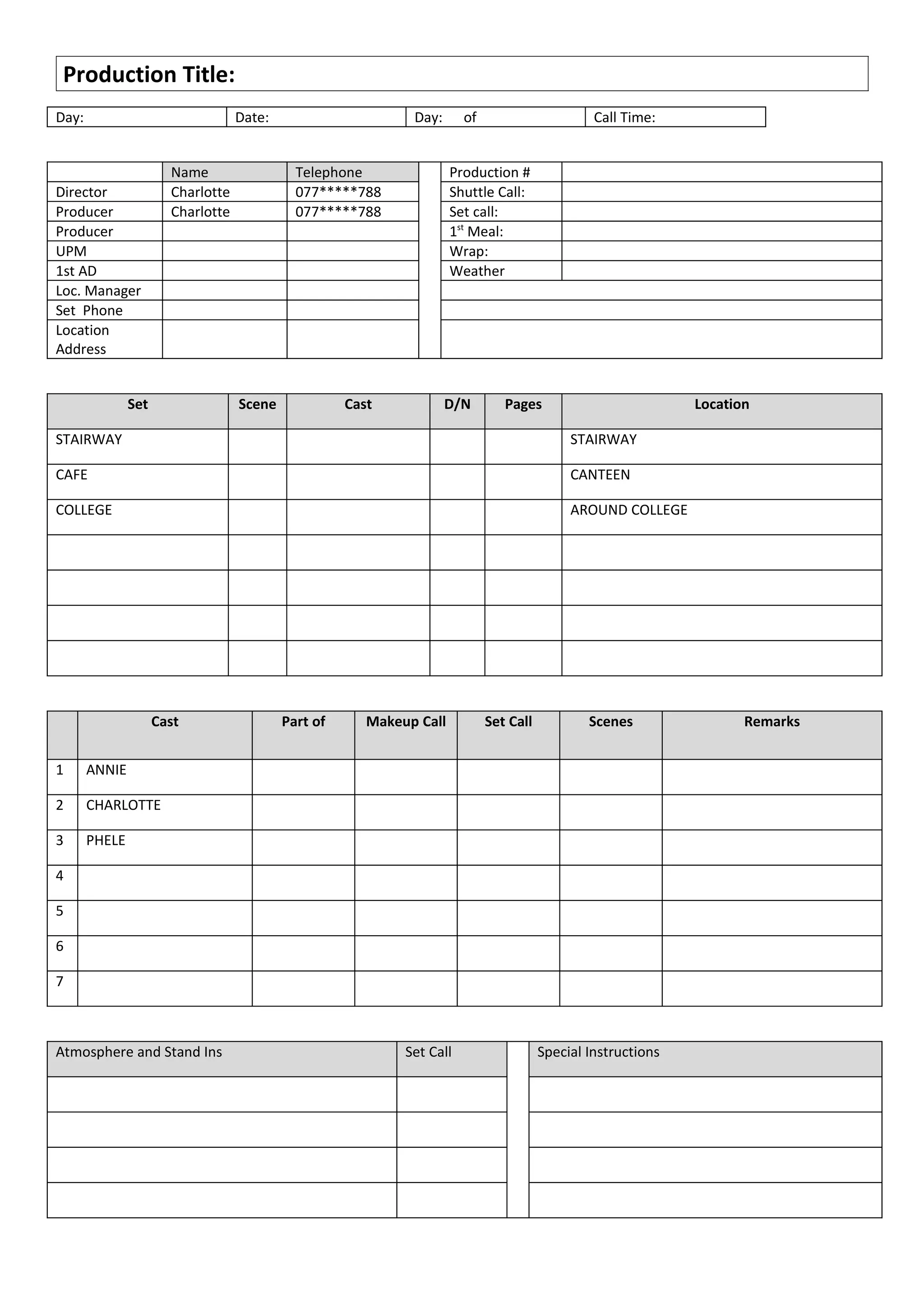 This document is a call sheet for a film production listing the director, producers, locations, scenes, cast and crew. It provides the production number, call times, and contact details. The call sheet schedules 3 scenes to be shot at a stairway, canteen and around a college. It lists the cast members and their call times, and notes on atmosphere, stand-ins, and special instructions. The crew positions include departments for production, art, makeup, wardrobe, camera, sound, electrical, grip, catering and production assistants.