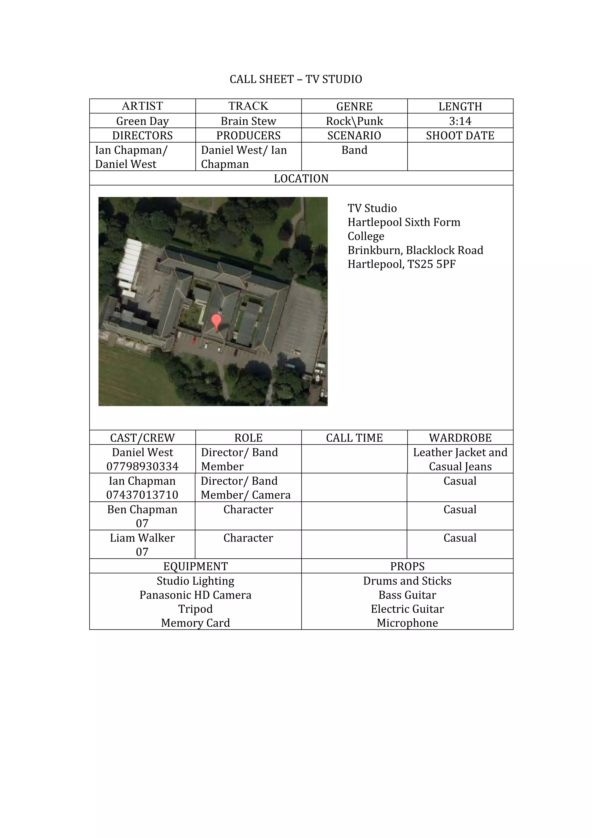 The document is a call sheet for filming the music video for the song "Brain Stew" by Green Day. It will take place on October 23rd at the TV studio of Hartlepool Sixth Form College. The directors, producers, and two band members/camera operator will arrive at 1pm along with two character actors. Equipment includes studio lighting, camera, tripod, and memory card. Props include drums, bass and electric guitars, and a microphone.