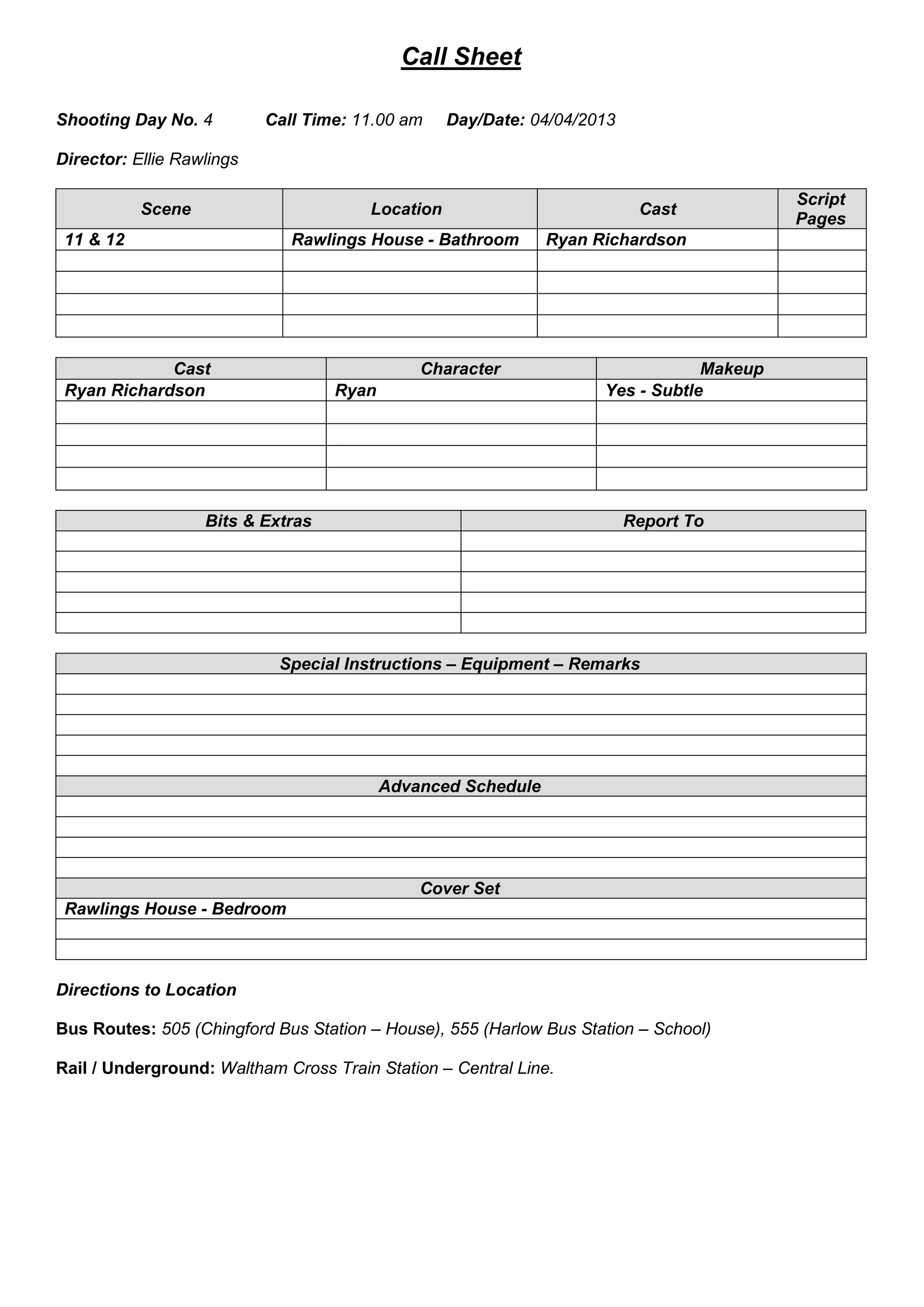 This call sheet is for shooting day 4 on April 4th, 2013. Scenes 11 and 12 will be filmed at the Rawlings House bathroom location. Ryan Richardson will play the character of Ryan and require subtle makeup. The advanced schedule covers setting up the Rawlings House bedroom. Transportation directions are provided for bus routes and rail to the shooting location.