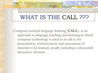 Computer-assisted language learning (CALL) uses computer technology to aid in the presentation, reinforcement, and assessment of language material. Early CALL focused on programmed instruction, while more recent terms like technology-enhanced language learning emerged. Typical CALL programs present a stimulus for the learner to respond to, and provide feedback. While early CALL focused mainly on technology, pedagogical considerations are now important to effectively integrate computers into language learning. Common CALL tools include commercial software, the world wide web, presentation software, and authoring software to create exercises.