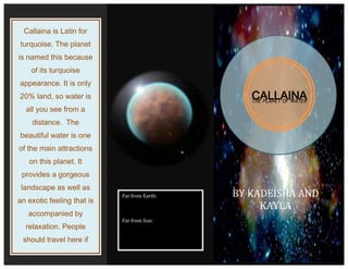 Callaina is a planet named for its turquoise appearance. It is 20% land with beautiful water visible from a distance, attracting visitors seeking relaxation. The water provides a gorgeous landscape and exotic feeling.