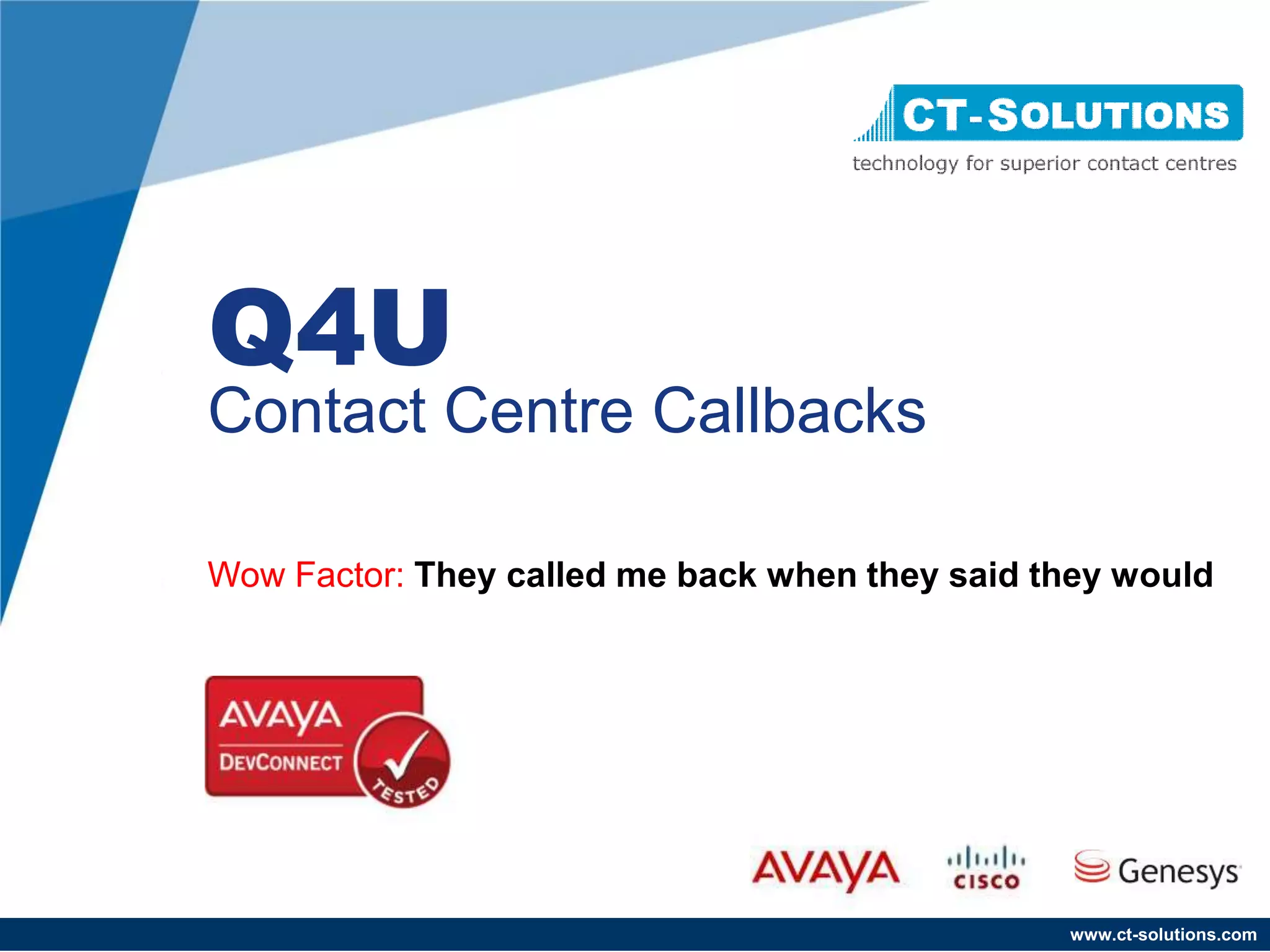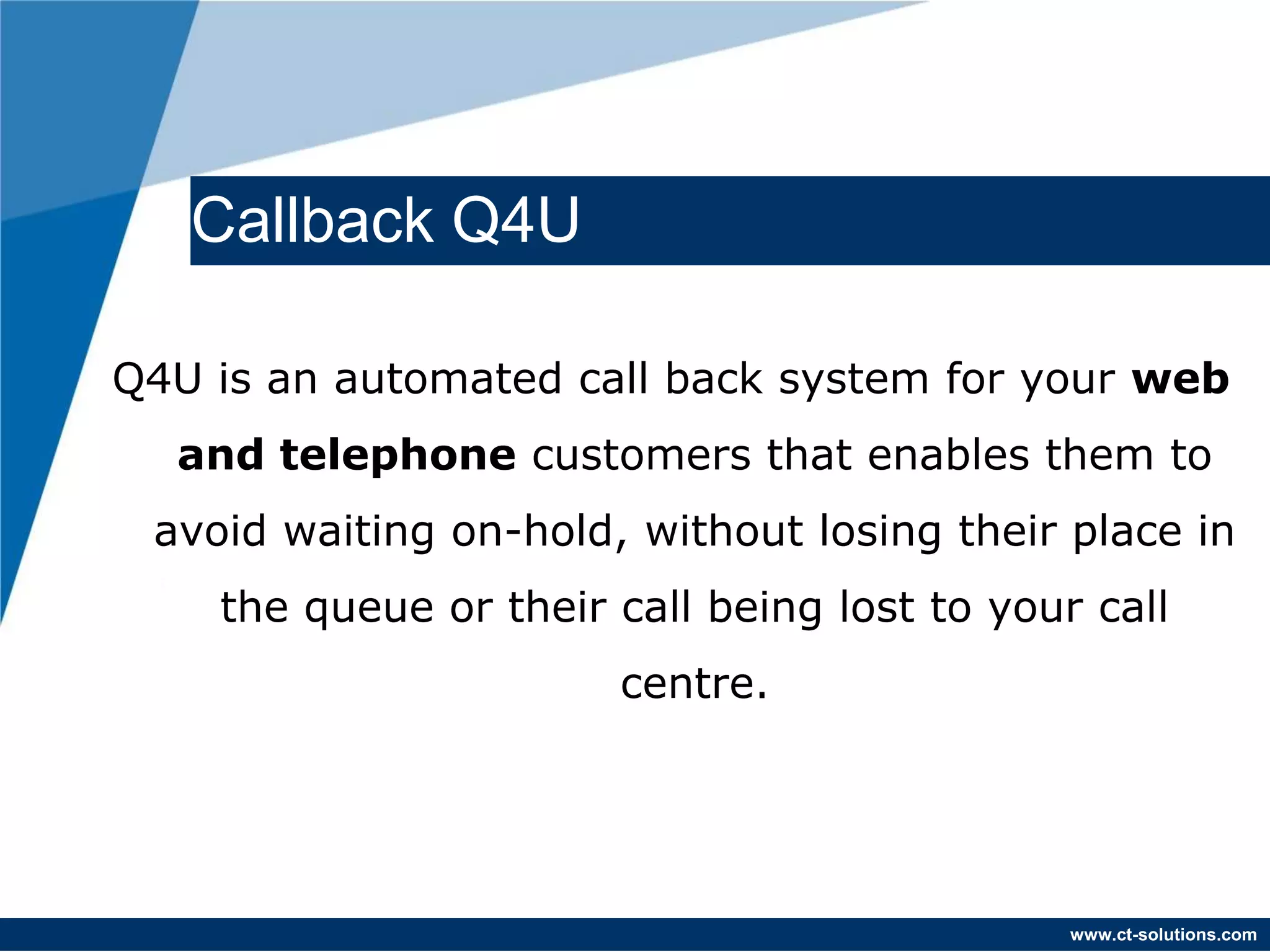 Q4U is an automated call back system that allows customers to avoid waiting on hold. It queues callback requests and notifies agents when it's time to return calls. This improves service levels by reducing wait times, increasing call capacity, and better utilizing agents. The system integrates with contact center software and CRMs to provide screen pops with customer information when callbacks are returned. It offers more efficient resource usage and higher customer satisfaction compared to simply hiring more agents.