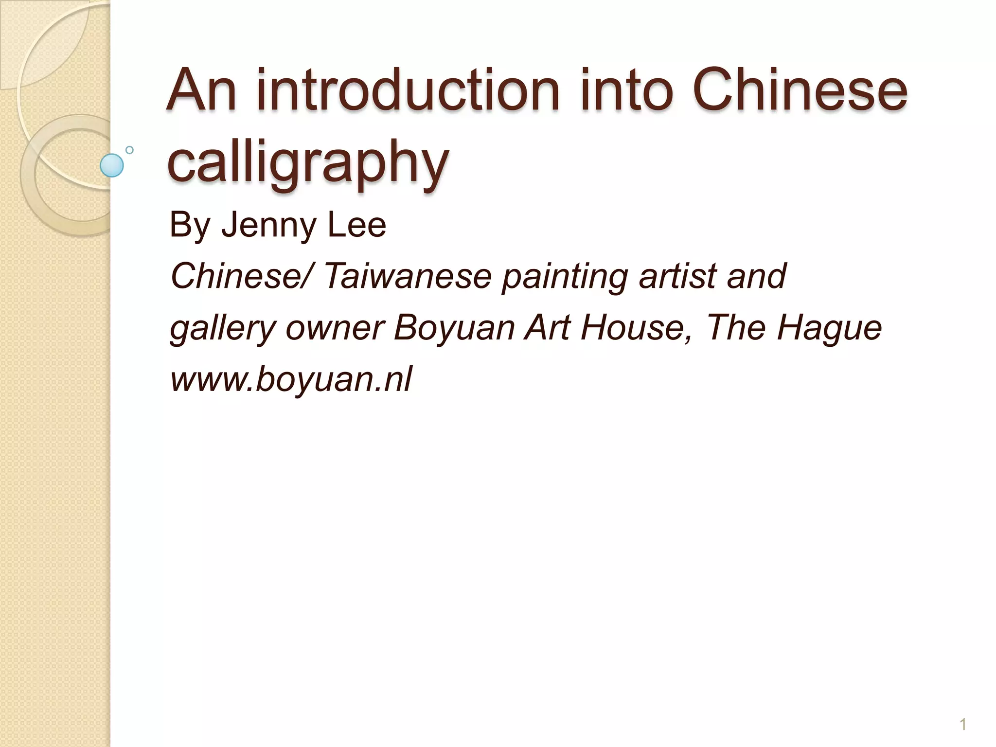 This document provides an introduction to Chinese calligraphy. It discusses the history and importance of calligraphy in Chinese culture. It describes the four main styles of calligraphy - seal script, clerical script, cursive script, and standard script. It also discusses materials used, how to hold a brush, basic strokes, and includes examples of calligraphy works. The purpose is to introduce the reader to Chinese calligraphy as an art form and important part of Chinese cultural heritage.
