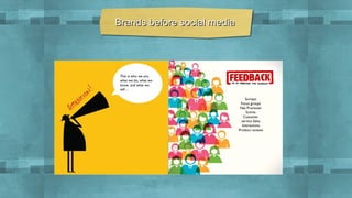 The document provides guidance for brands on using social media effectively. It emphasizes that people are talking about brands online even if brands aren't participating. It encourages brands to steer conversations by helping buyers navigate their journeys and to use social media to build their brand up rather than tear others down. The document also stresses that brands are no longer the loudest voice and that good judgment is needed when using social media. It provides tips for complying with social media policies, defining your niche, selecting platforms, finding support from others, and getting started with social media.