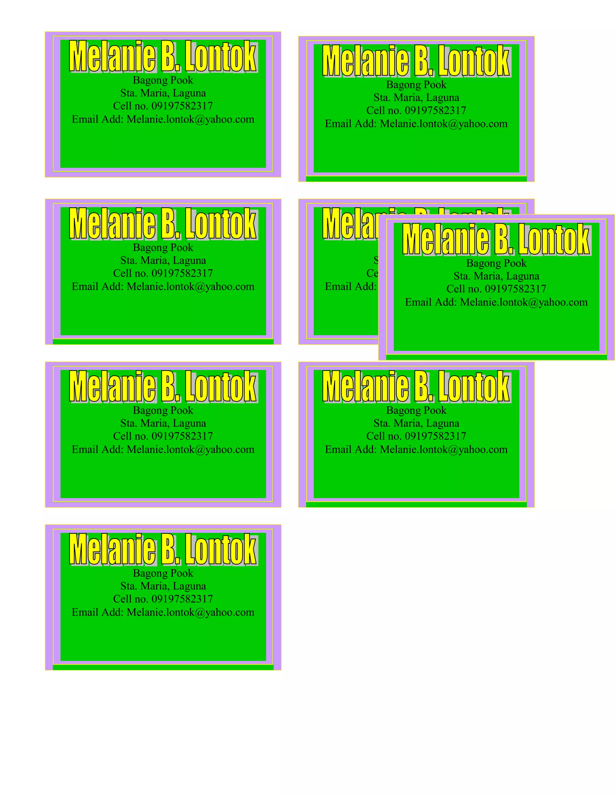 The document contains contact information for Melanie Lontok including her address in Bagong Pook, Sta. Maria, Laguna, cell phone number 09197582317, and email address Melanie.lontok@yahoo.com repeated multiple times.