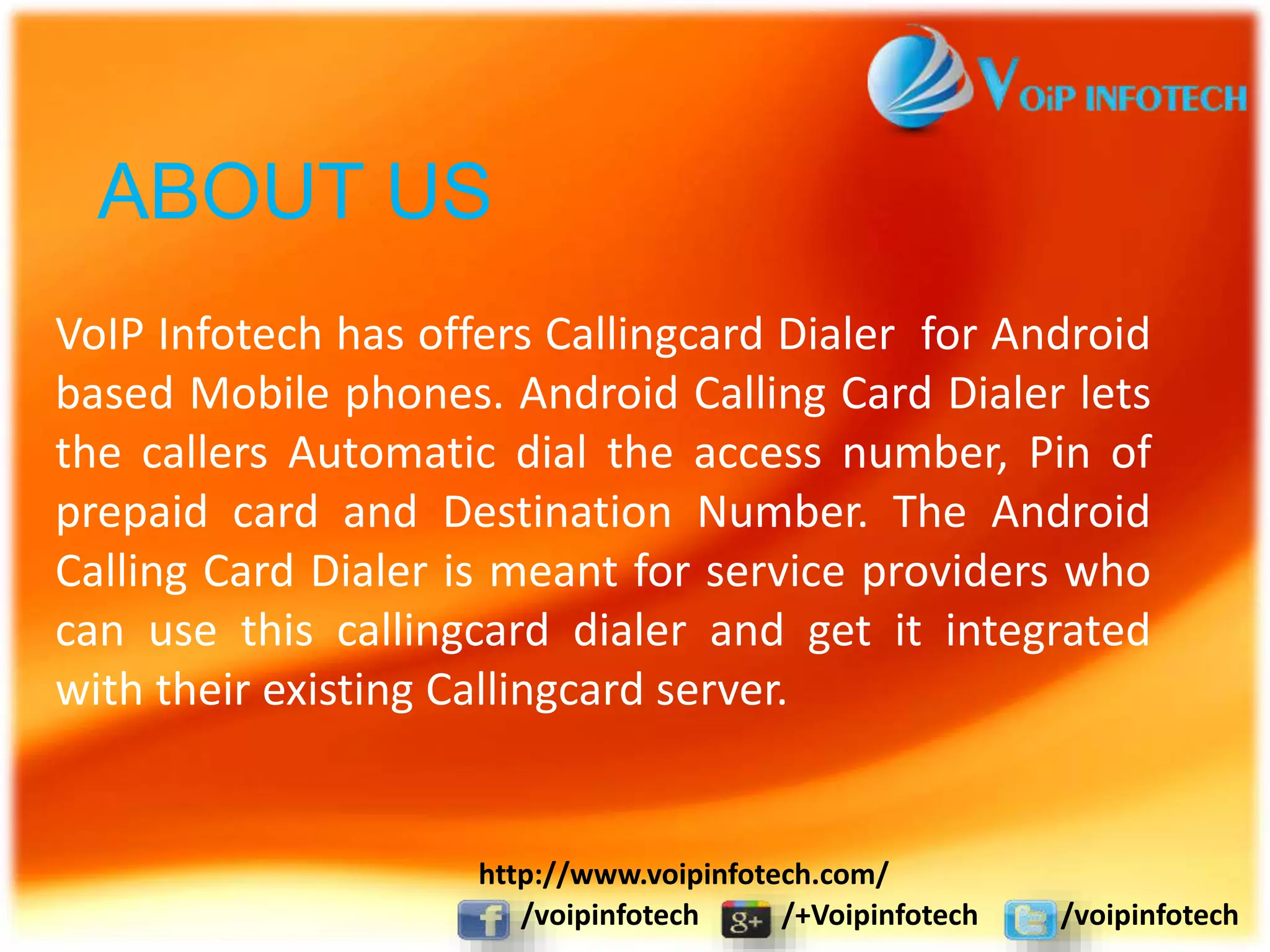 VoIP Infotech offers an Android-based calling card dialer that automates the dialing of access numbers and PINs for prepaid cards, aimed at service providers. The dialer features include customized branding, unlimited licensing, and synchronization with the phone's address book. It supports various versions of Android and integrates with standard calling card servers.