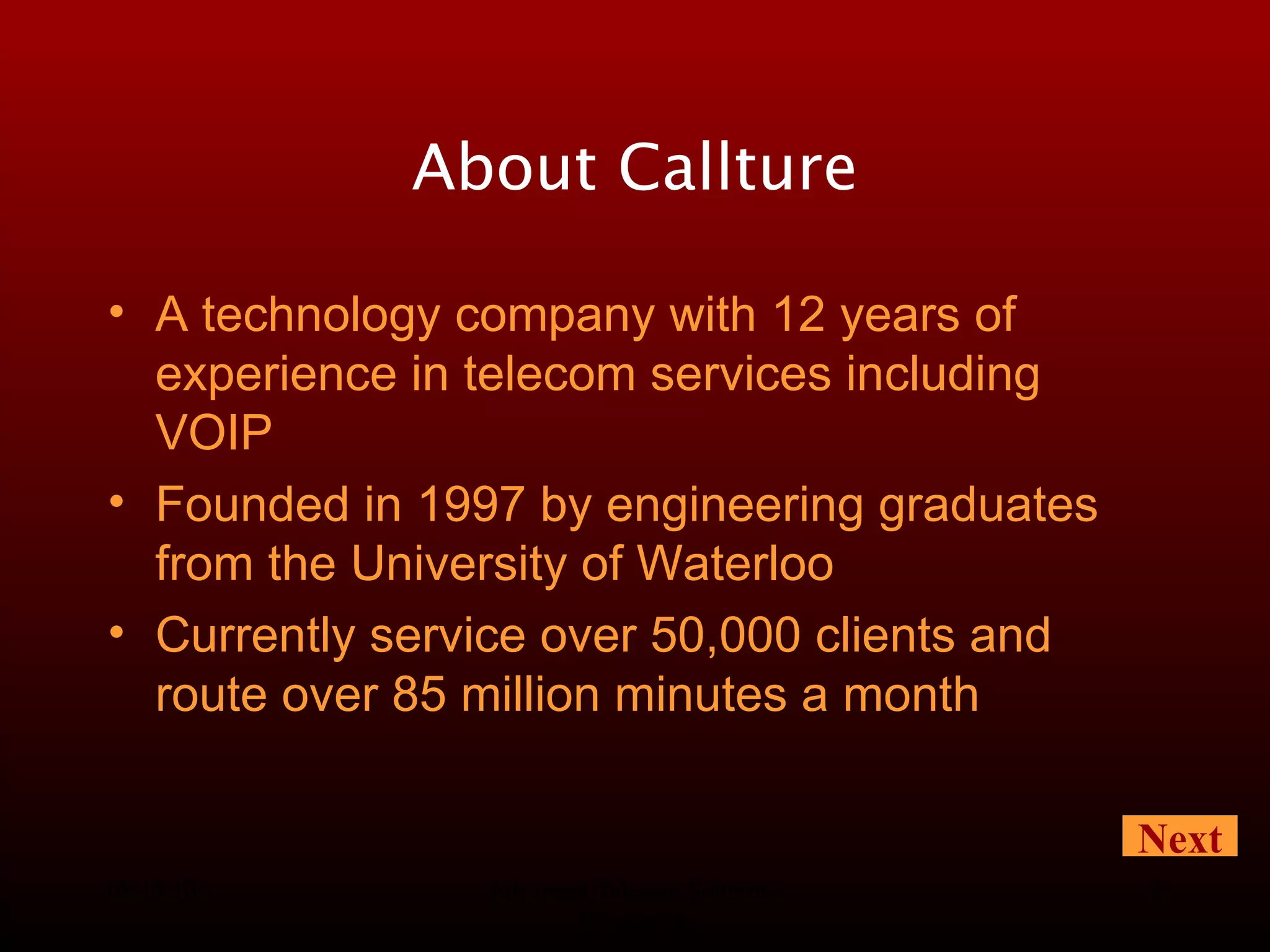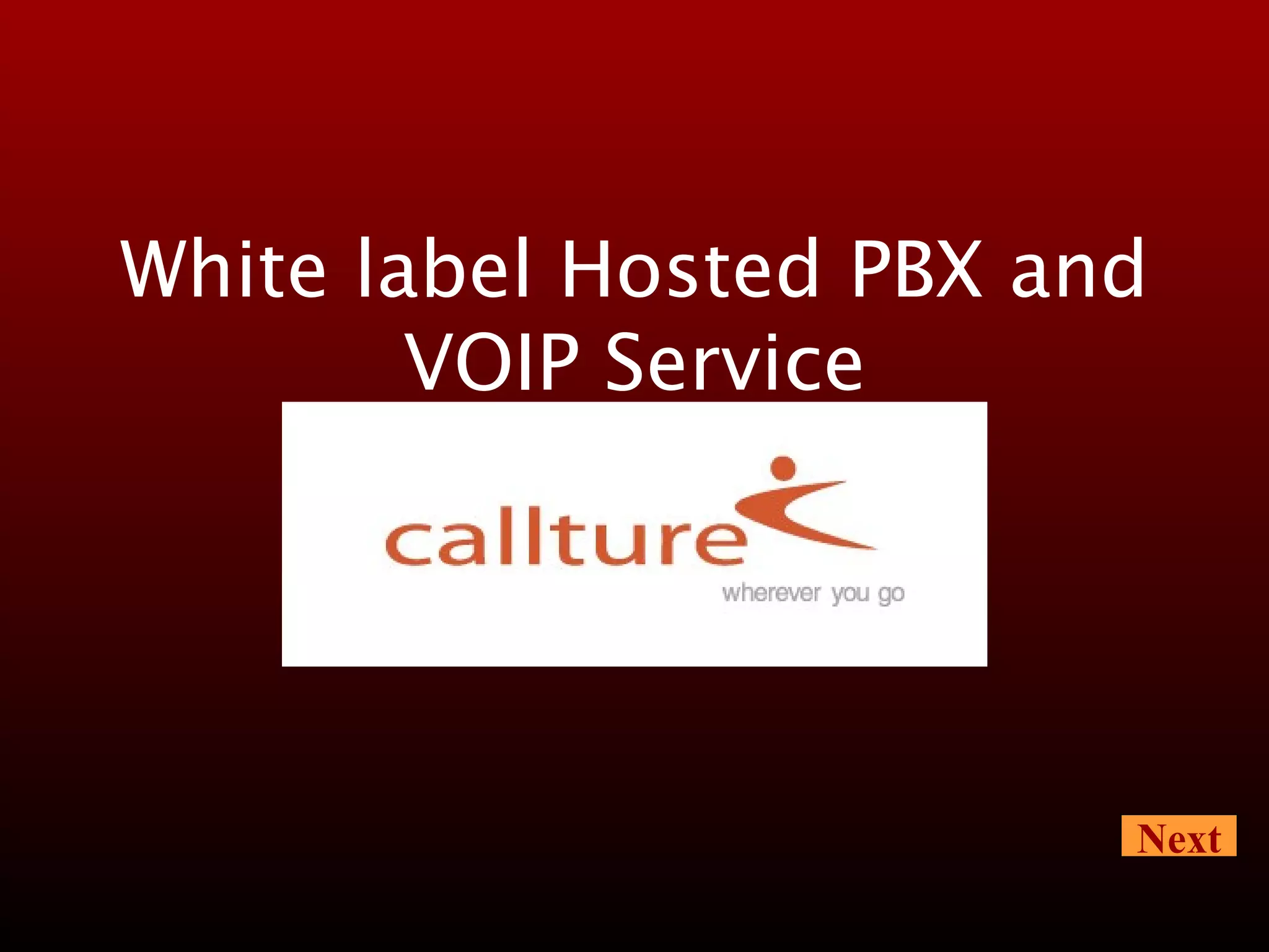 Callture is a technology company founded in 1997 that provides white label hosted PBX and VOIP services. It has over 12 years of experience in telecom services and currently serves over 50,000 clients. Callture has made significant investments in its network architecture and softswitch to provide a flexible and feature-rich telecom solution. It offers clients an end-to-end turnkey solution with no upfront costs and revenue sharing.