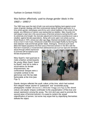 This document discusses how fashion was used from the 1960s-1990s to challenge and change traditional gender ideals. It provides examples such as Mary Quant's mini skirt in the 1960s which promoted female sexuality and empowerment. In the 1970s, David Bowie used androgynous fashion as his alter ego Ziggy Stardust to blur gender lines. The 1990s Riot Grrrl movement addressed issues like rape and abuse through their fashion, though some argue it promoted female objectification. Overall, the document examines how iconic figures manipulated fashion to both advance and sometimes undermine feminist messages and ideals of their time periods.