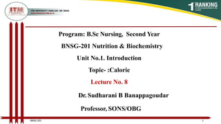 The document provides an overview of nutrition and biochemistry concepts including calorie, basal metabolic rate (BMR), and factors that affect BMR. It defines a calorie as a unit of energy and notes that fat, protein, and carbohydrates contain different calories per gram. BMR is described as the minimum energy needed to maintain basic body functions like circulation and respiration, accounting for about 60% of daily energy expenditure. Factors that influence BMR include nutritional state, body size, composition, hormones, temperature, and drugs. The document outlines how BMR is measured and clinical applications.