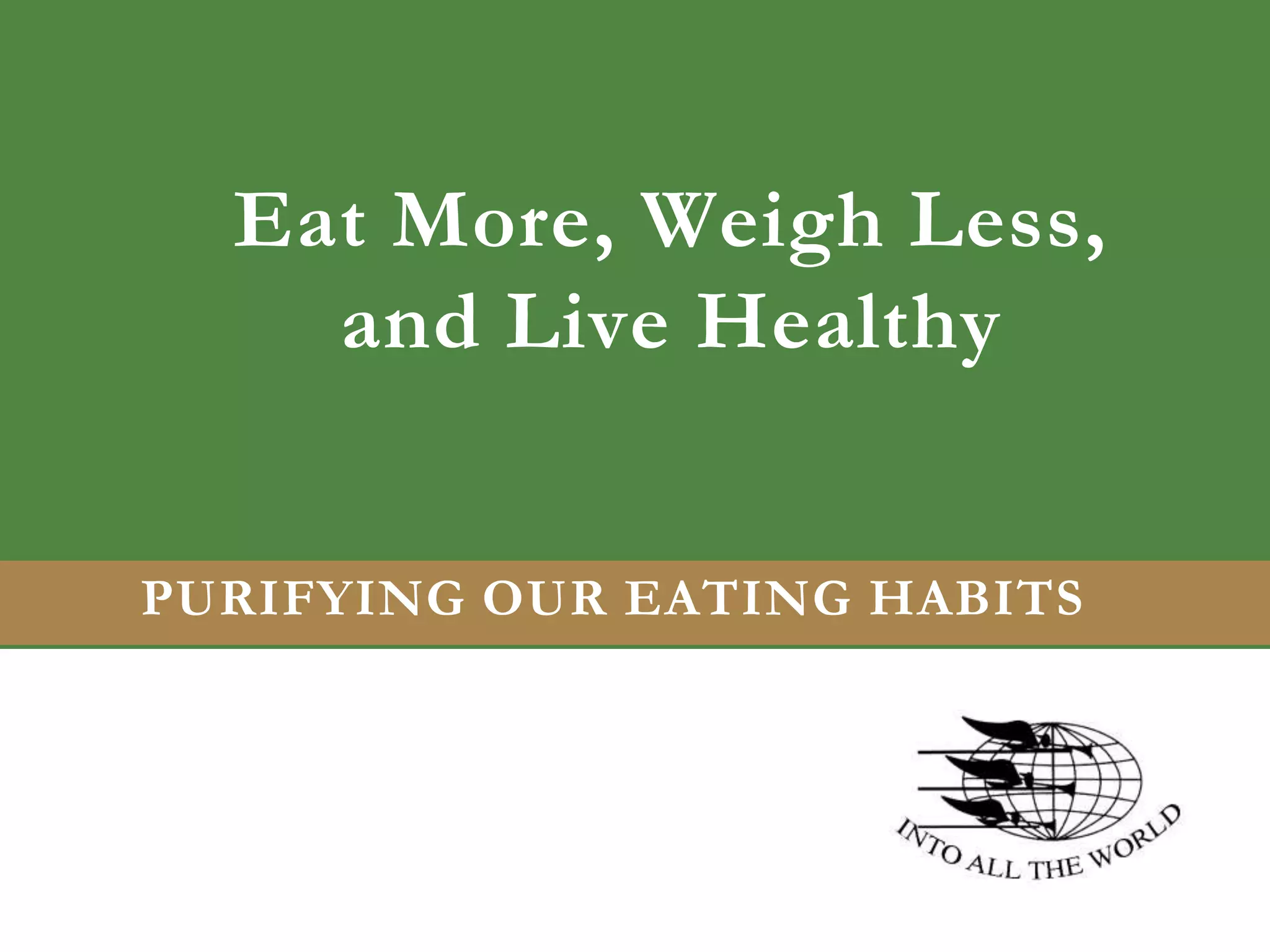 This document provides information on healthy eating and lifestyle habits. It discusses establishing SMART plans and using a self-management toolbox to support physical activity, healthy eating, stress management, symptom management, communication with one's healthcare team, and other wellness practices. The document also covers common nutrition education messages, diet-related diseases, Virginia-specific disease statistics, principles of temperance, carbohydrates and their processing, calorie density and satiety, and healthy eating guidelines. The overall message is that making small, achievable changes to diet and lifestyle can significantly improve health and prevent disease.