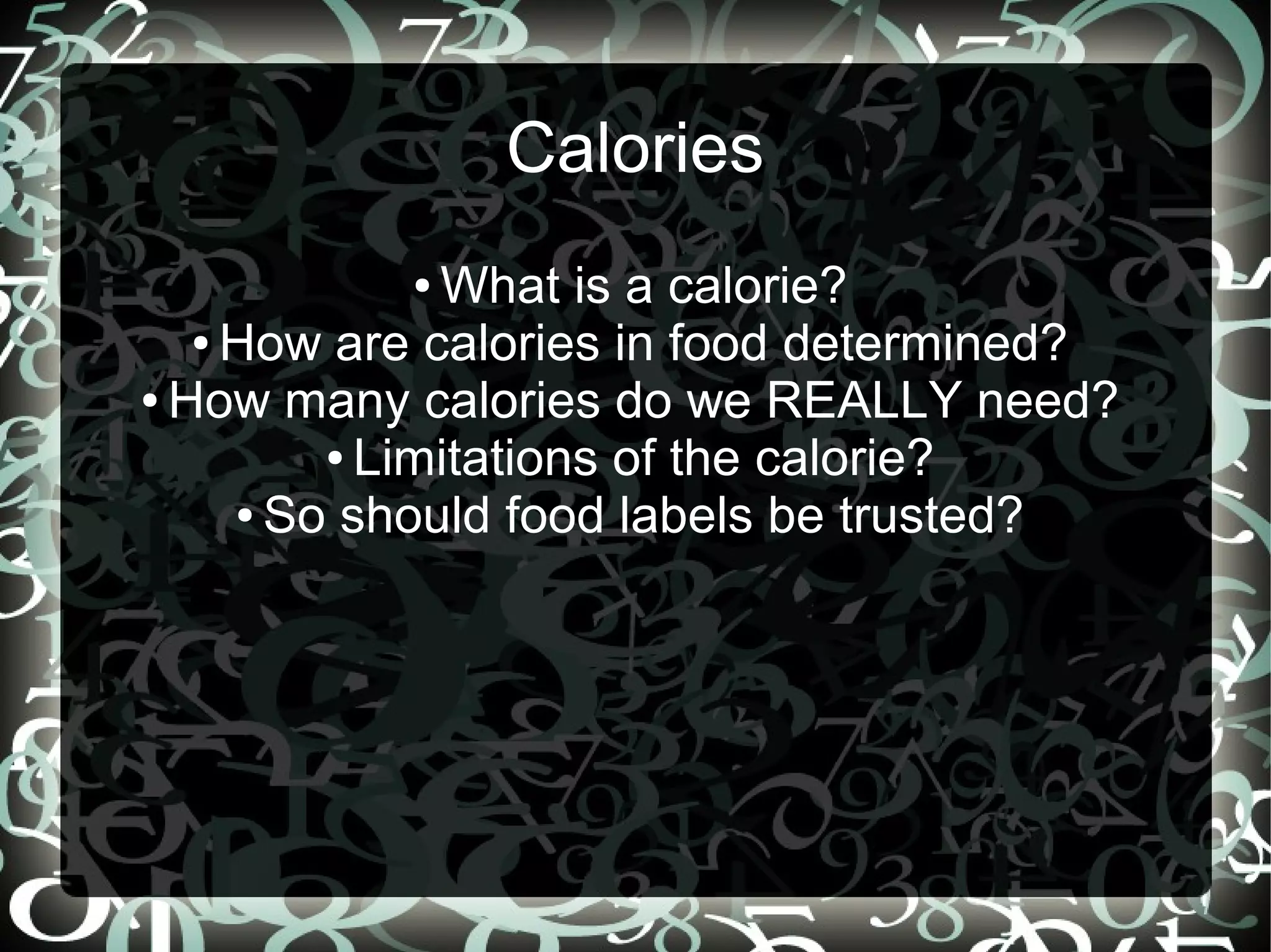 Calories are a unit of energy but determining accurate calorie counts is complex. Food labels may not always be trusted as the Atwater system uses averages that don't account for individual food properties or processing. Additionally, different foods require varying amounts of energy to digest. Quality of calories, not just quantity, is important for health and weight. Focusing only on calorie counting risks oversimplifying a multifaceted issue.