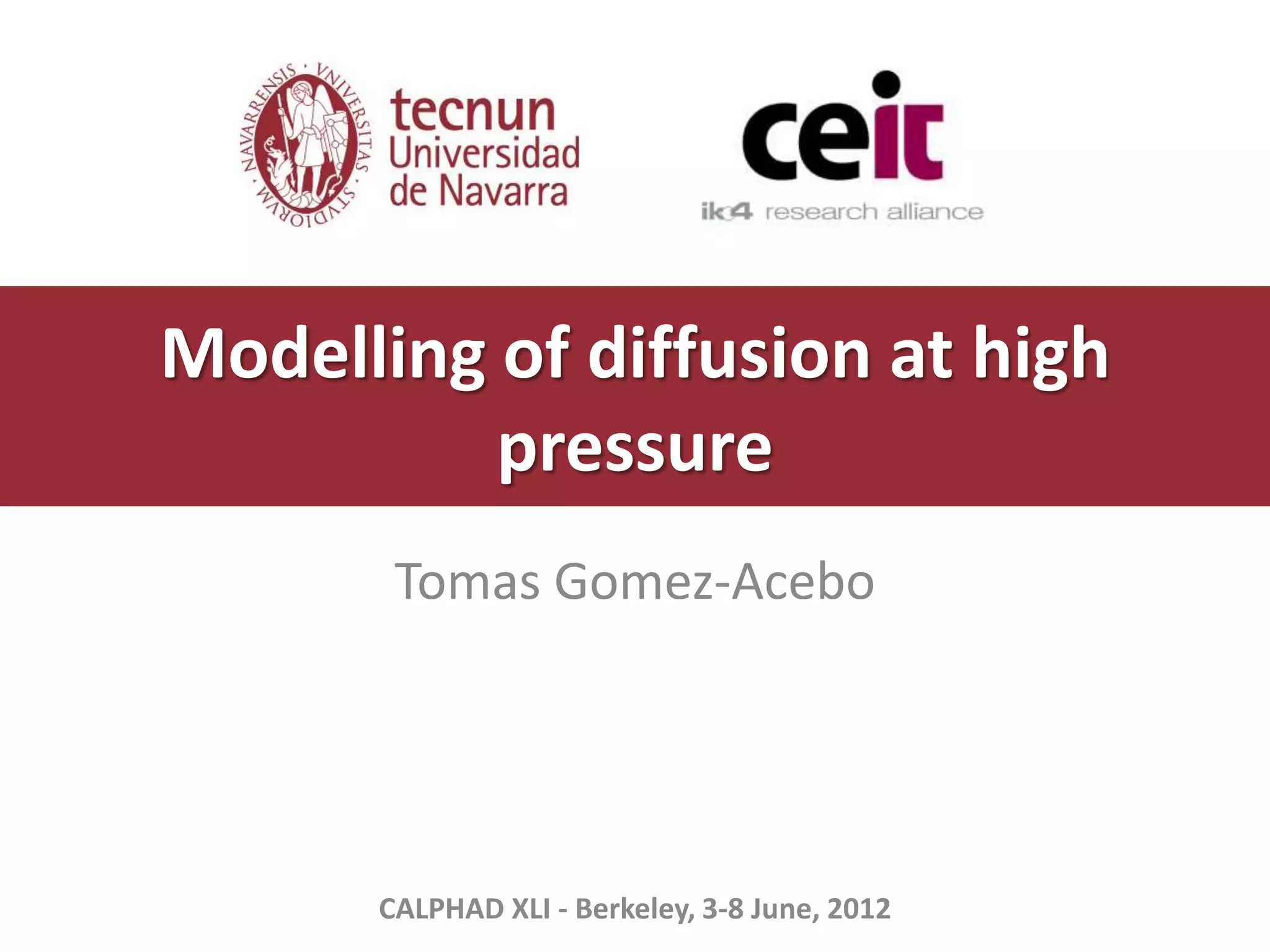 This document summarizes modeling of diffusion at high pressure. It discusses when pressure is important for diffusion, defines activation volume, and explores correlations between activation volume and bulk material properties. It then outlines the Calphad approach for modeling diffusion, including defining necessary parameters. Finally, it assesses activation volumes for diffusion in the Fe-Ni system using experimental data, and shows good agreement between calculated and measured diffusion profiles up to 23 GPa.